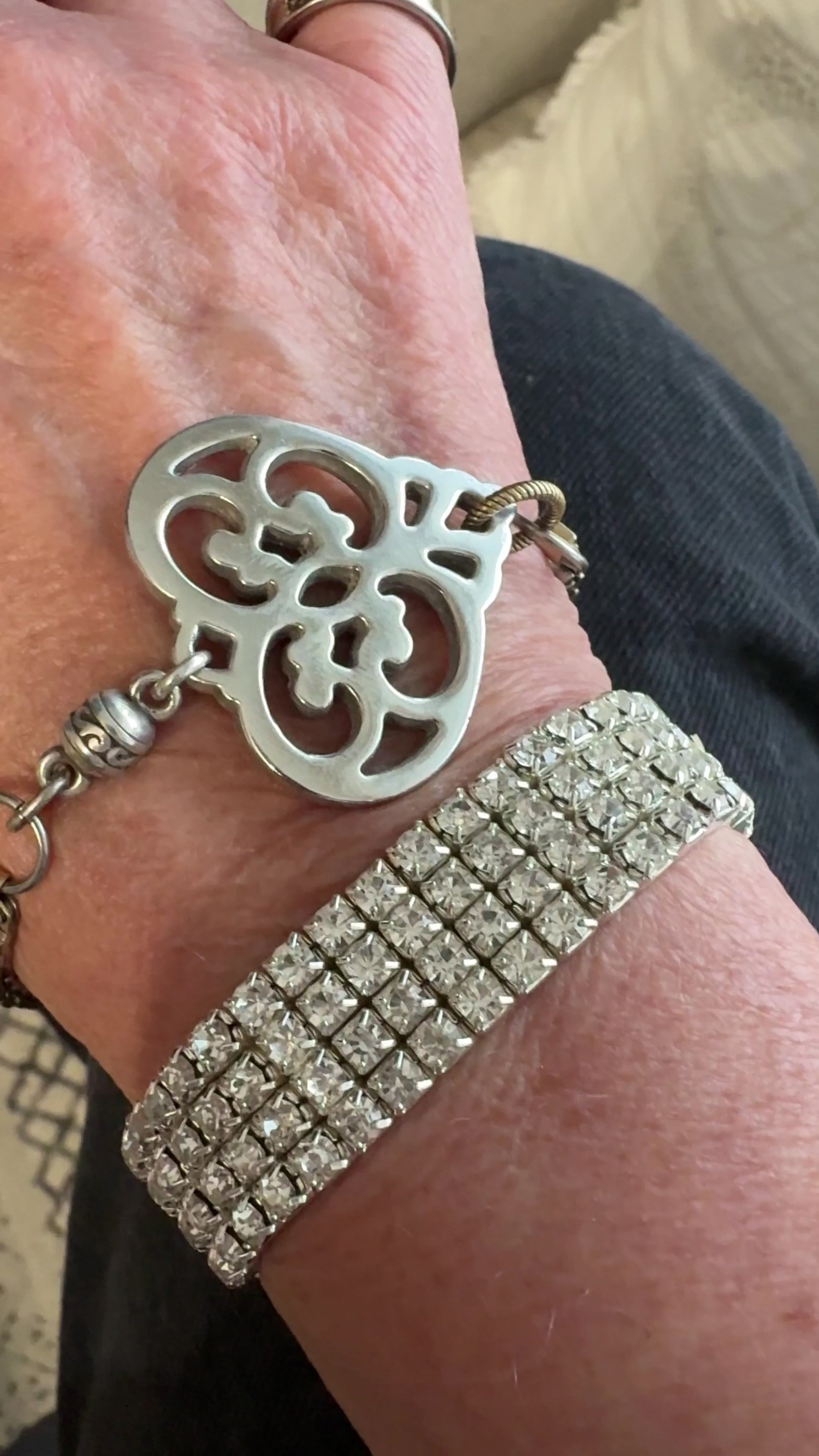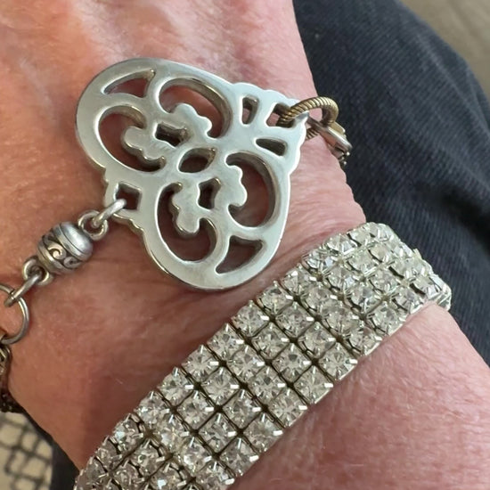 Beautifully boho chic, this one of a kind bracelet, features an intricately designed,gleamin silver heart, that has been added to a vintage, gold toned expandable watch band. This light weight bracelet is very comfortable to wear, & brings new meaning to the word timeless.