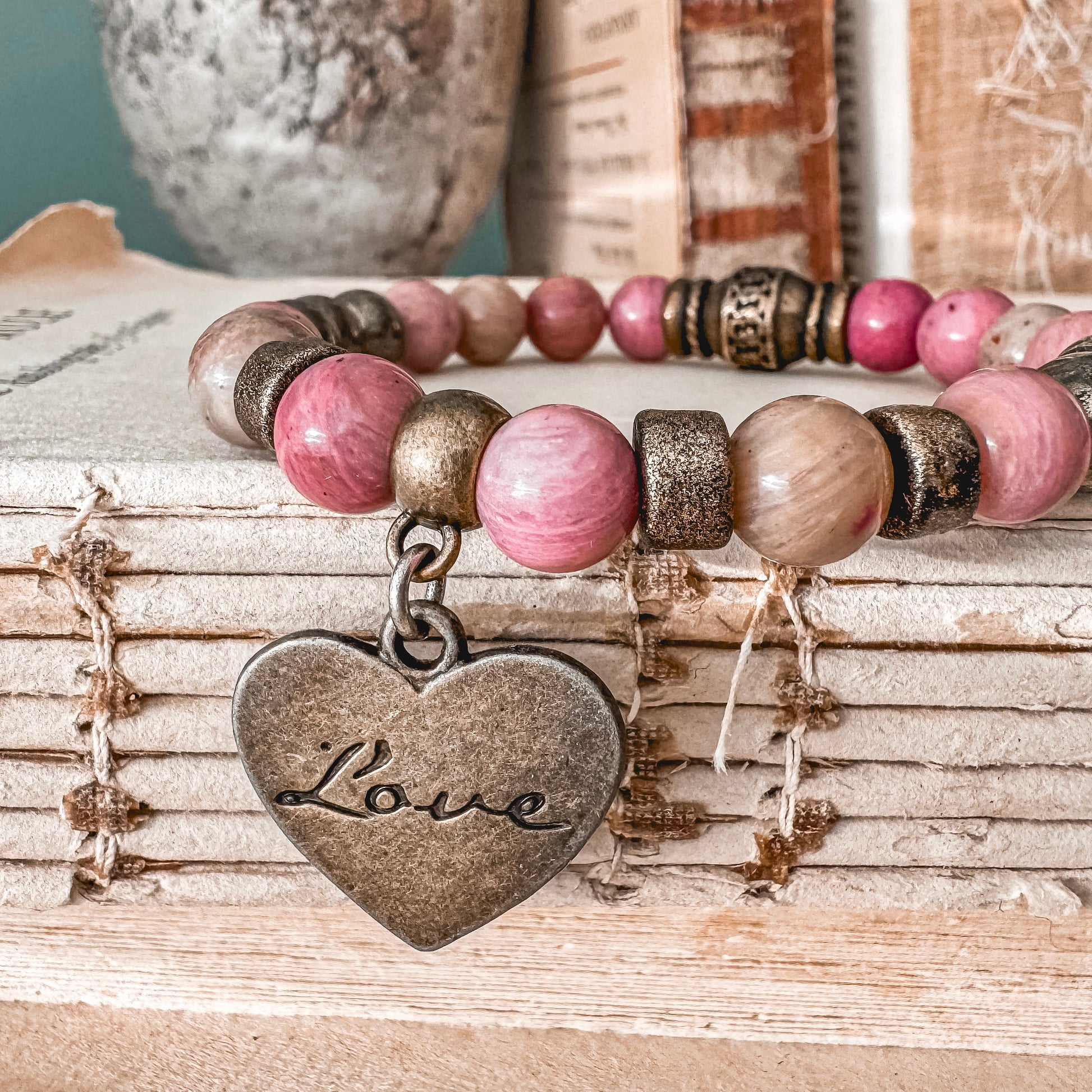 Celebrate love all year round with this boho chic stretch bracelet. Created with dreamy tones of blush pink, rose, and sand gemstones, combined with moody metallics in hues of grey, aged gold and antiqued brass, this Love bracelet perfectly transitions from winter to spring. A salvaged vintage brass bead adds soul & texture, and the heart with "Love" written In script form, adds the romance. Let this boho beauty become your year-round love letter to yourself.