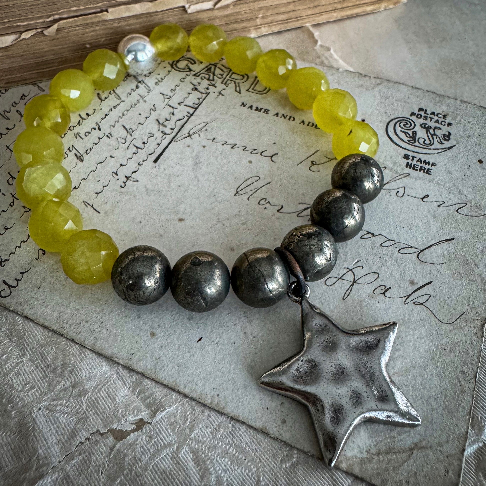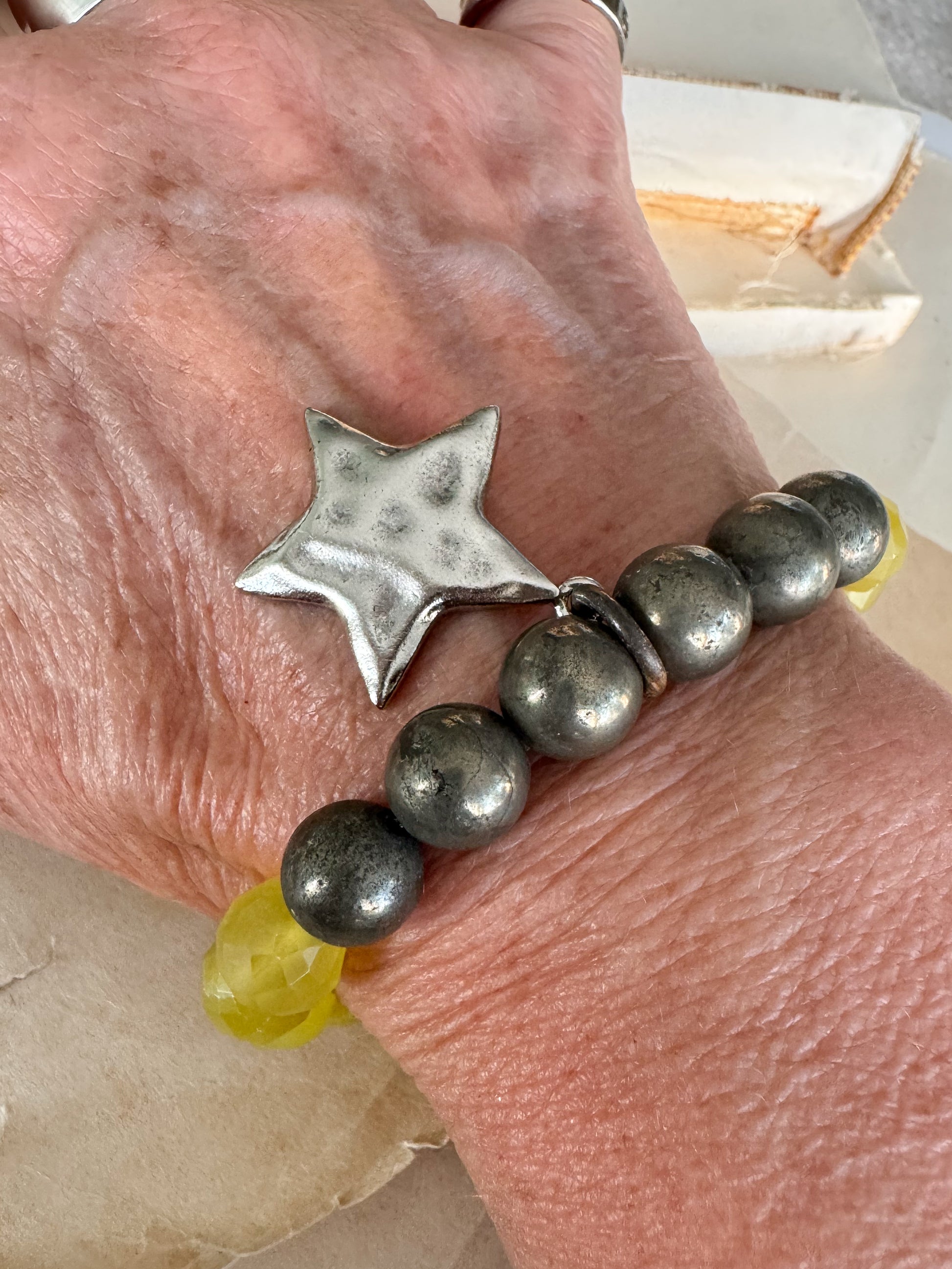 This bracelet blends cozy silver gray tones with vibrant citrus lemon yellow for a truly eye catching look. Adorned with a hammered pewter star charm, it radiates zesty celestial vibes that are sure to get you compliments galore!