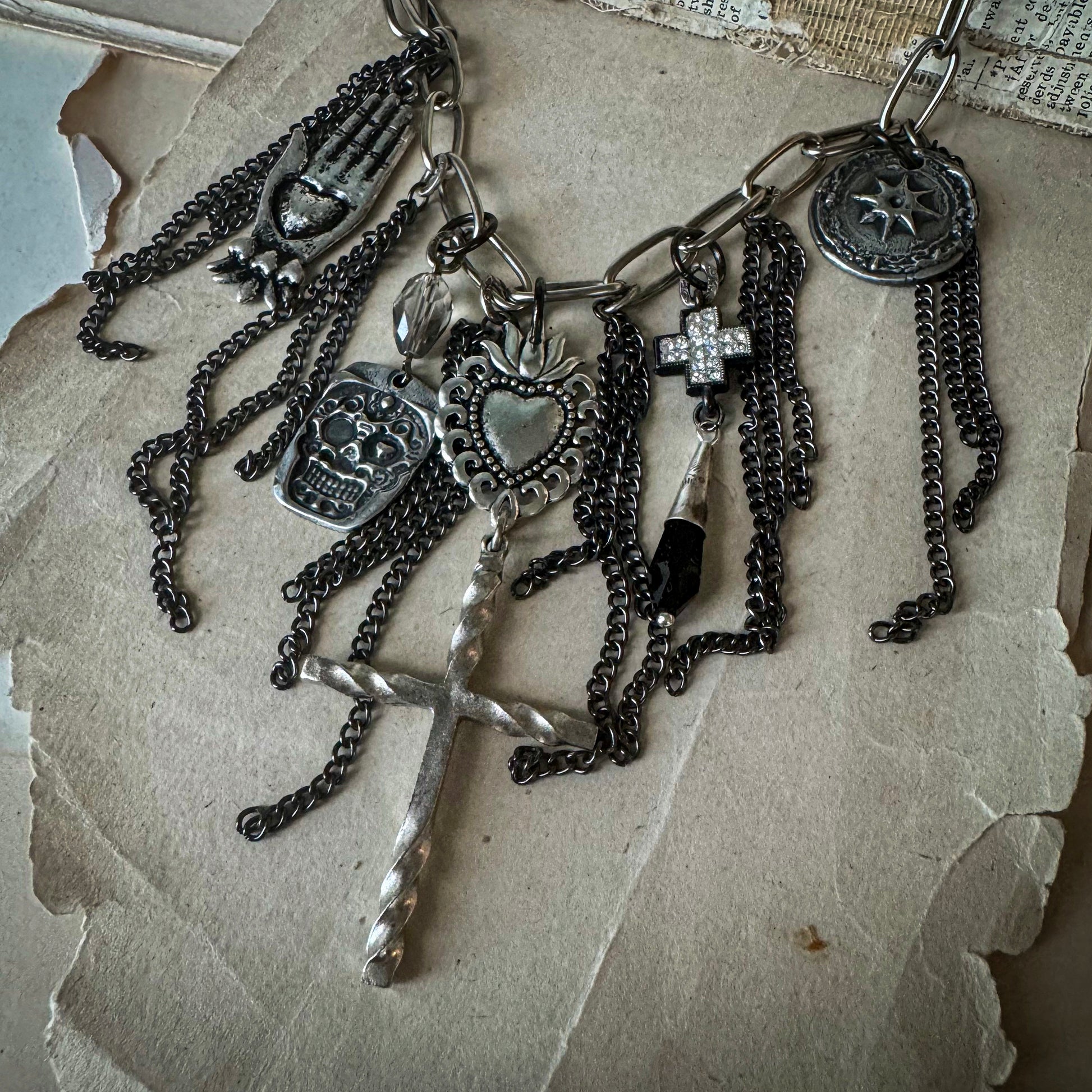 A unique blend of amulets and charms inspired by the Day of the Dead celebration. This necklace features antiqued silver and aged pewter, highlighted with hints of midnight black and sultry gunmetal grey. Mystical charms hang from striking paperclip chain links, enhanced by sections of reclaimed vintage chain, making this special boho chic necklace truly one of a kind.
