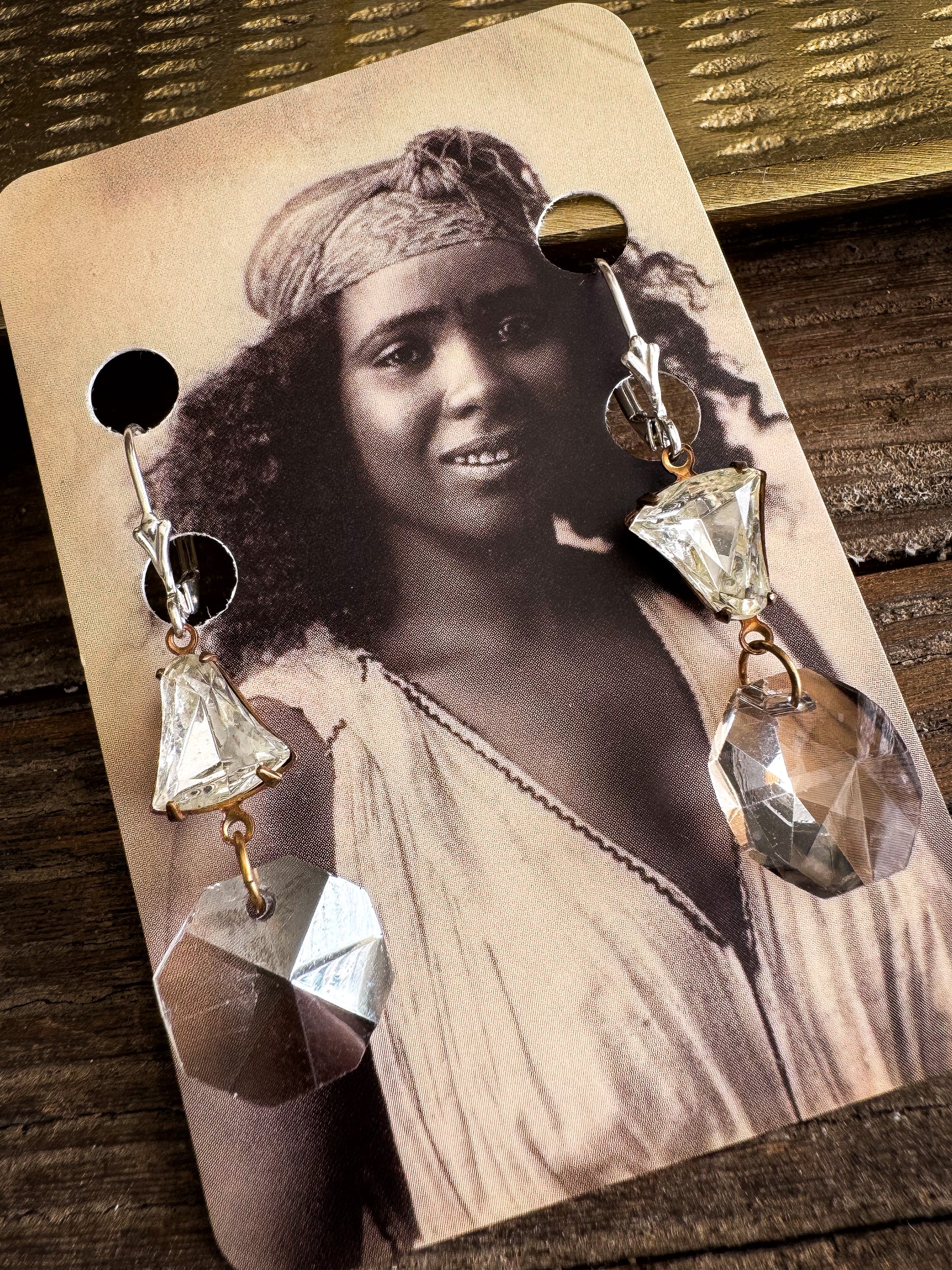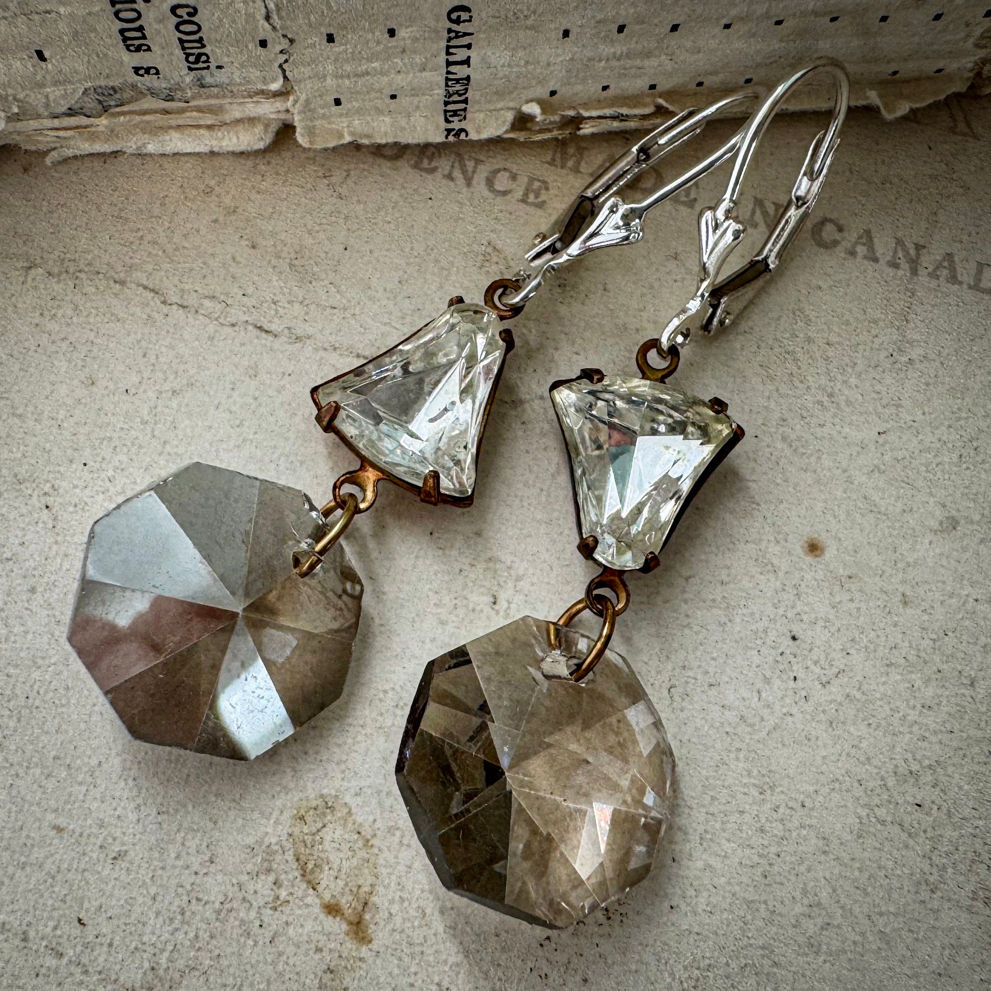 Celebrate in style with these fabulous shabby glam earrings. Featuring foiled vintage bell cut glass stones, paired with repurposed silvery grey chandelier crystals, that catch the light with every movement. Take a closer look and spot the playful reversed bell shaped stones for a whimsical boho flair.