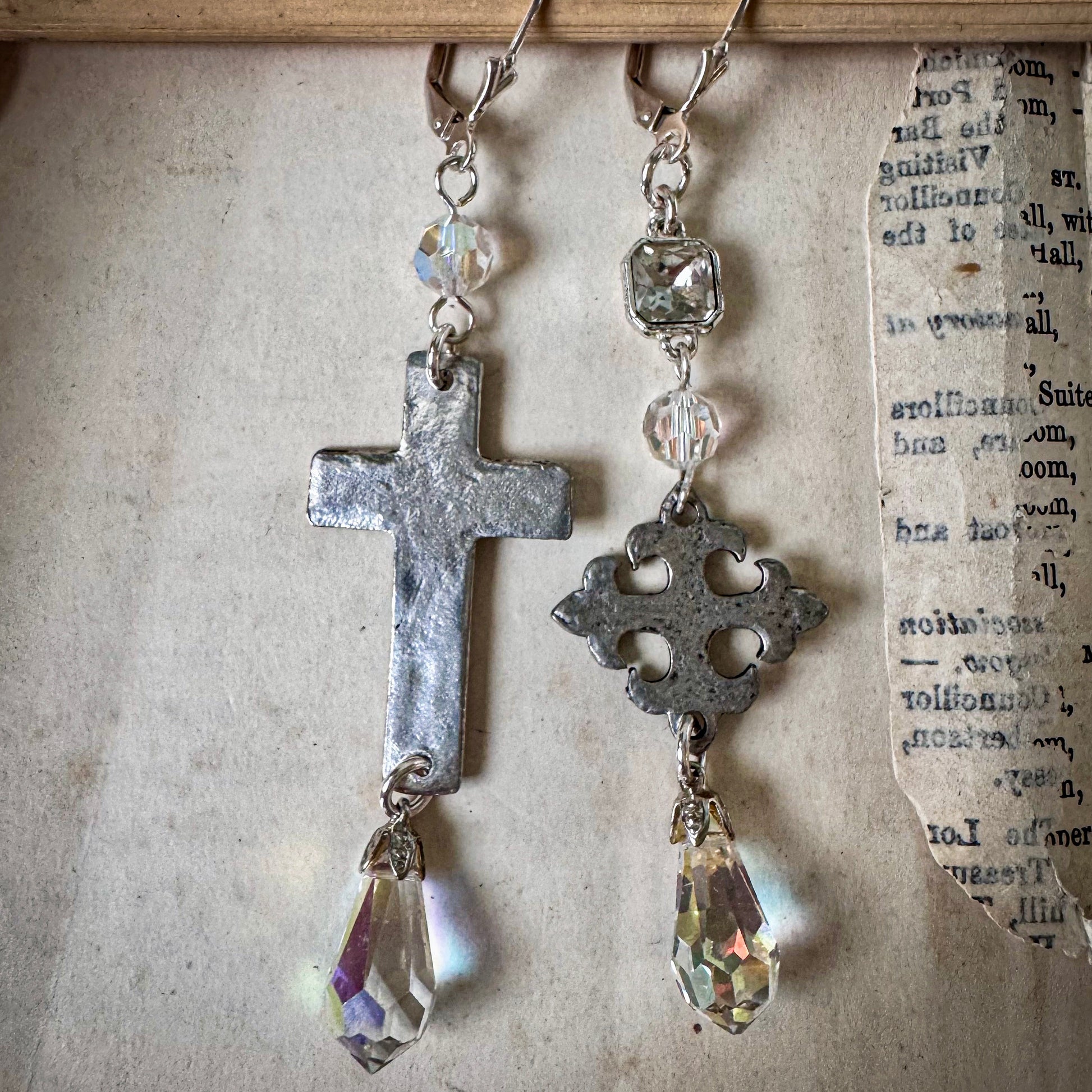These striking asymmetrical earrings turn heads wherever you go! Combining two styles of rustic silver pewter crosses, with salvaged glimmering crystals, these long, yet feather light earrings add your unique style to everything you wear.