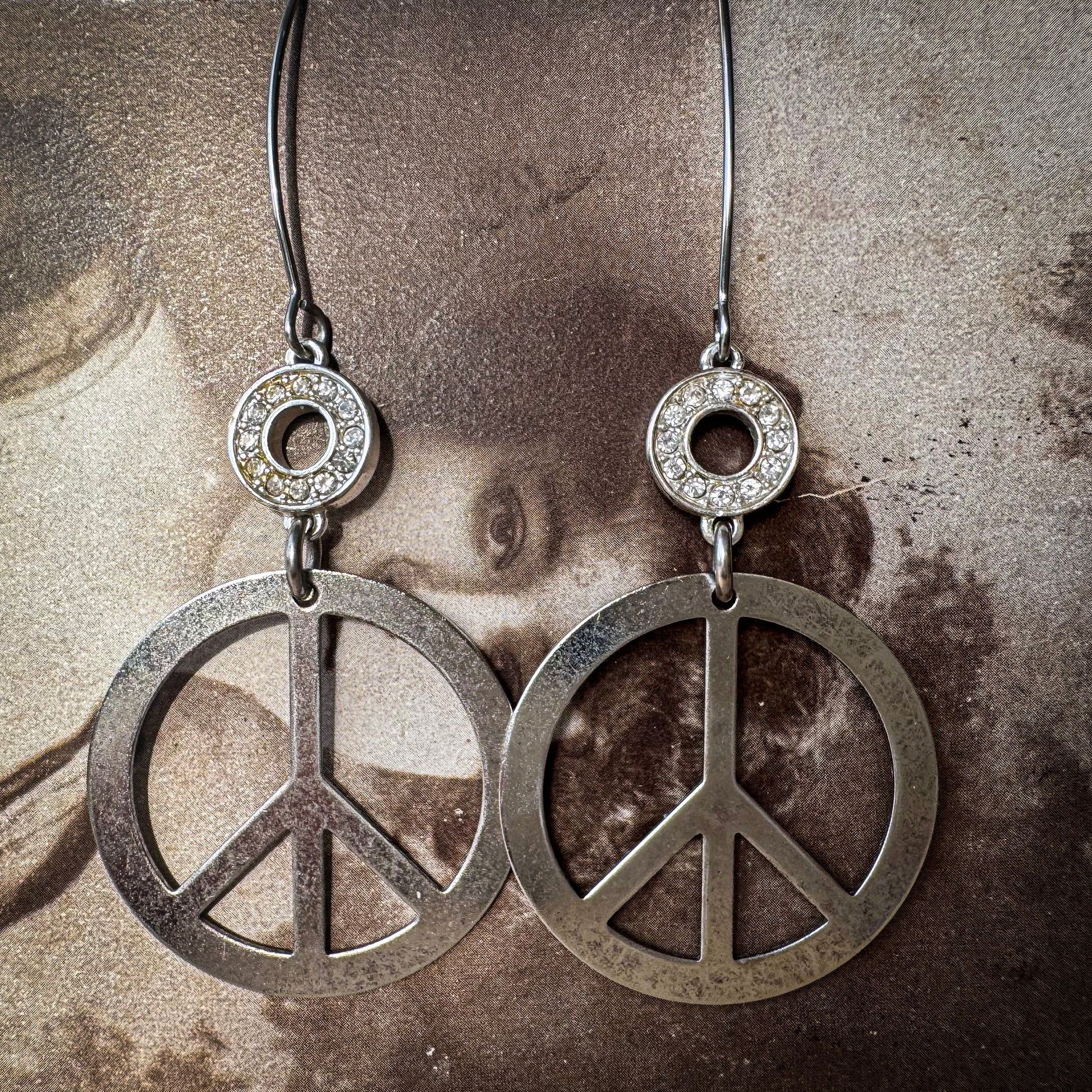 Make a statement with these vintage inspired peace earrings that celebrate effortless boho glam style. Featuring peace charms finished in antique silver pewter, and accented with salvaged, sparkling rhinestone pave connectors.