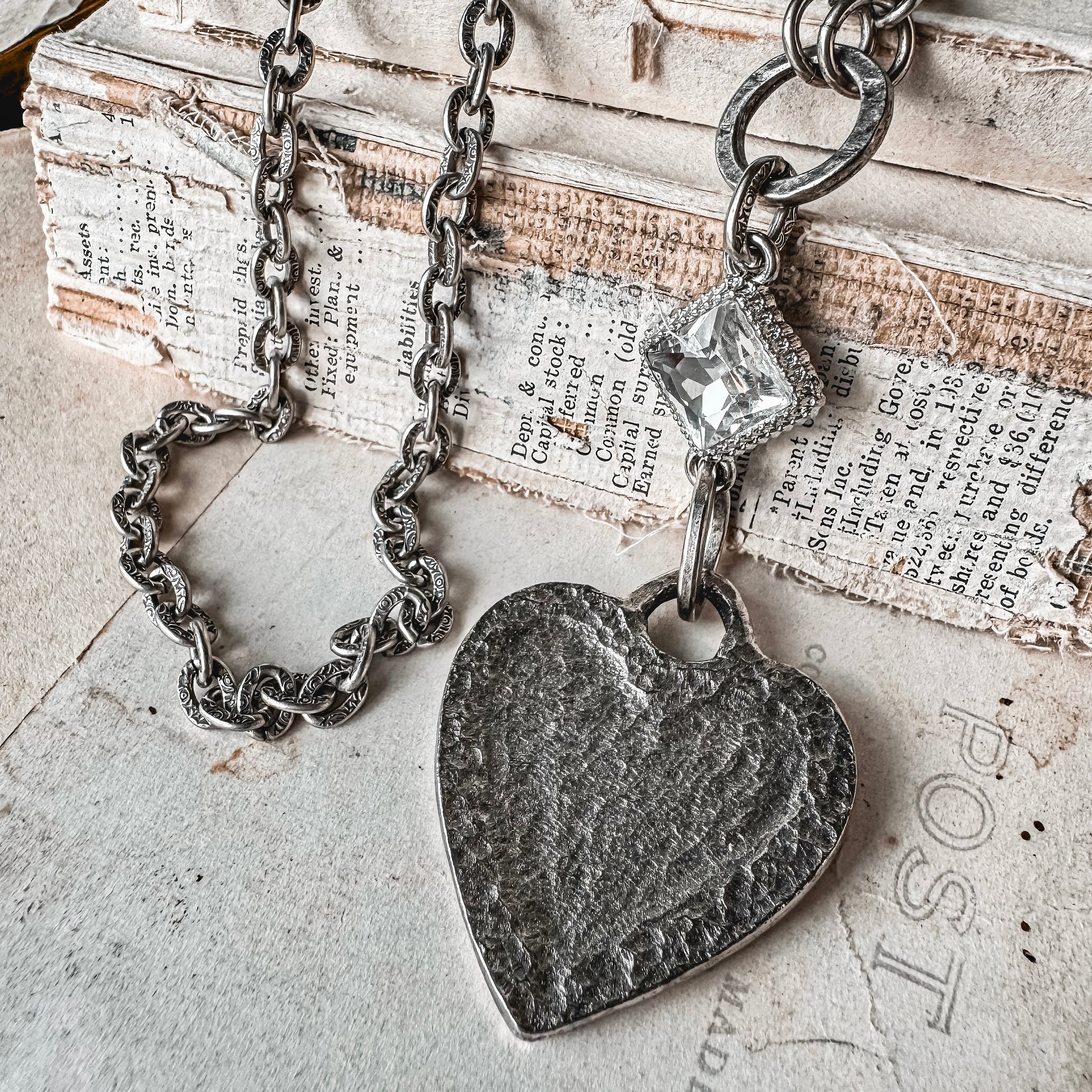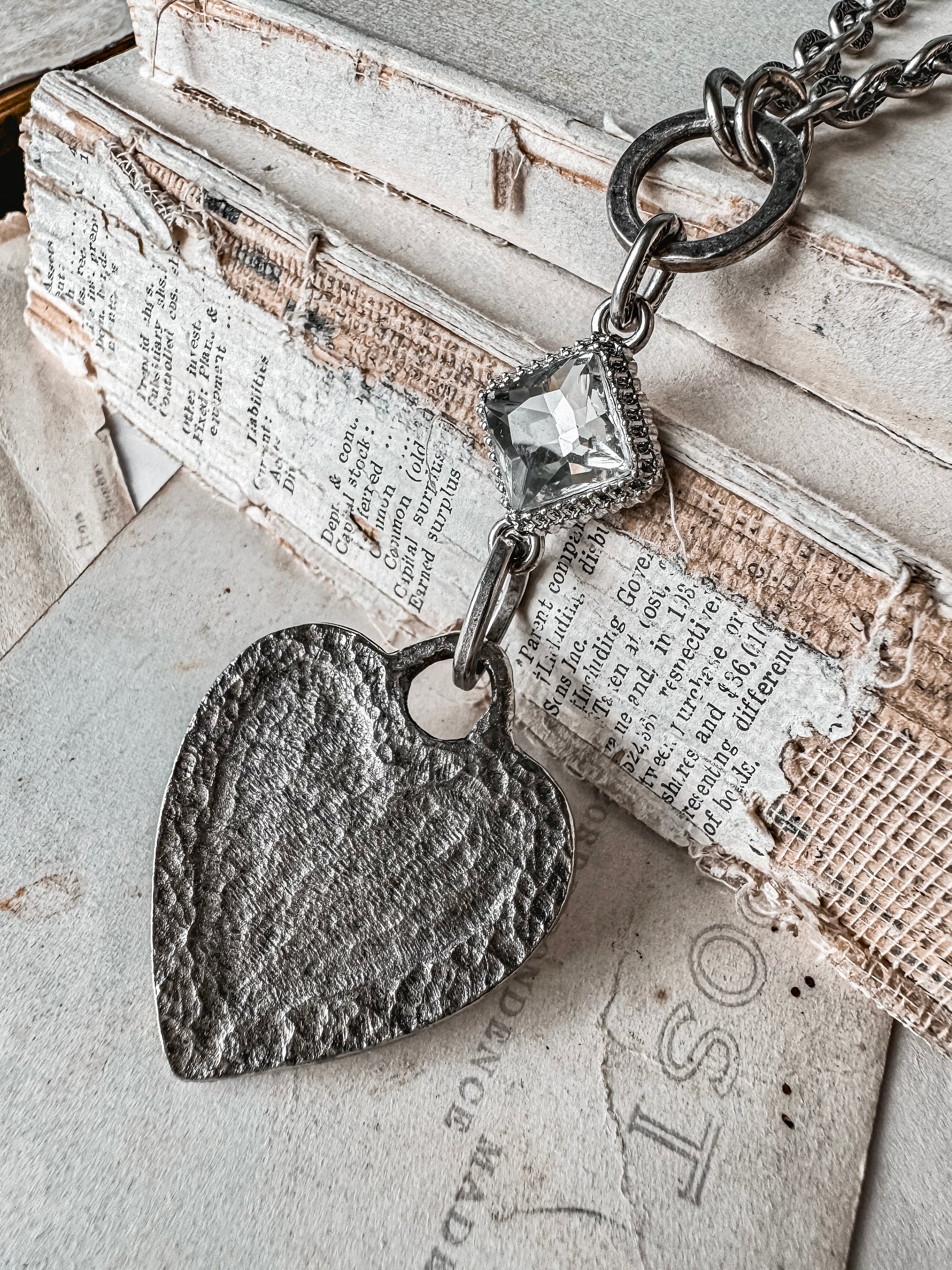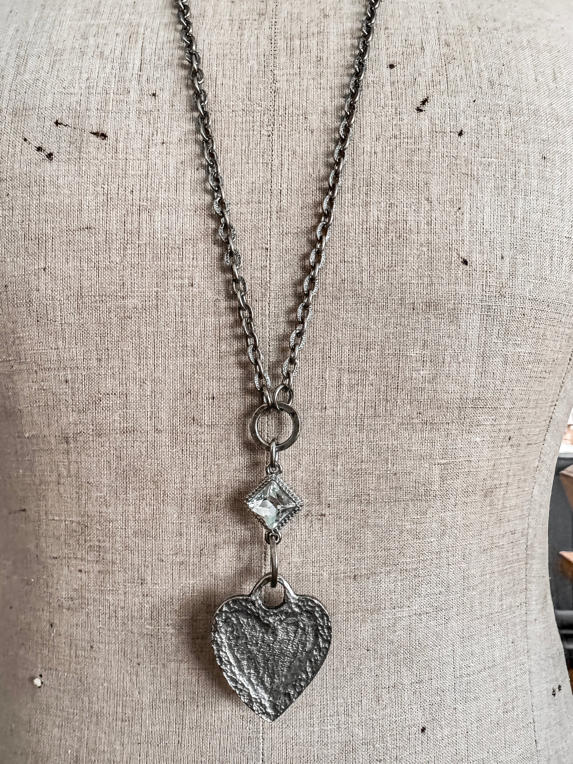 Show off your dazzling personality with this long style, heart pendant necklace. Blending rustic boho vibes with an undeniable touch of glamour. This artisan designed pewter heart gets a pretty touch of sparkle from a radiant, diamond shaped rhinestone. Effortlessly slip this beauty over your head & instantly elevate everything you wear.