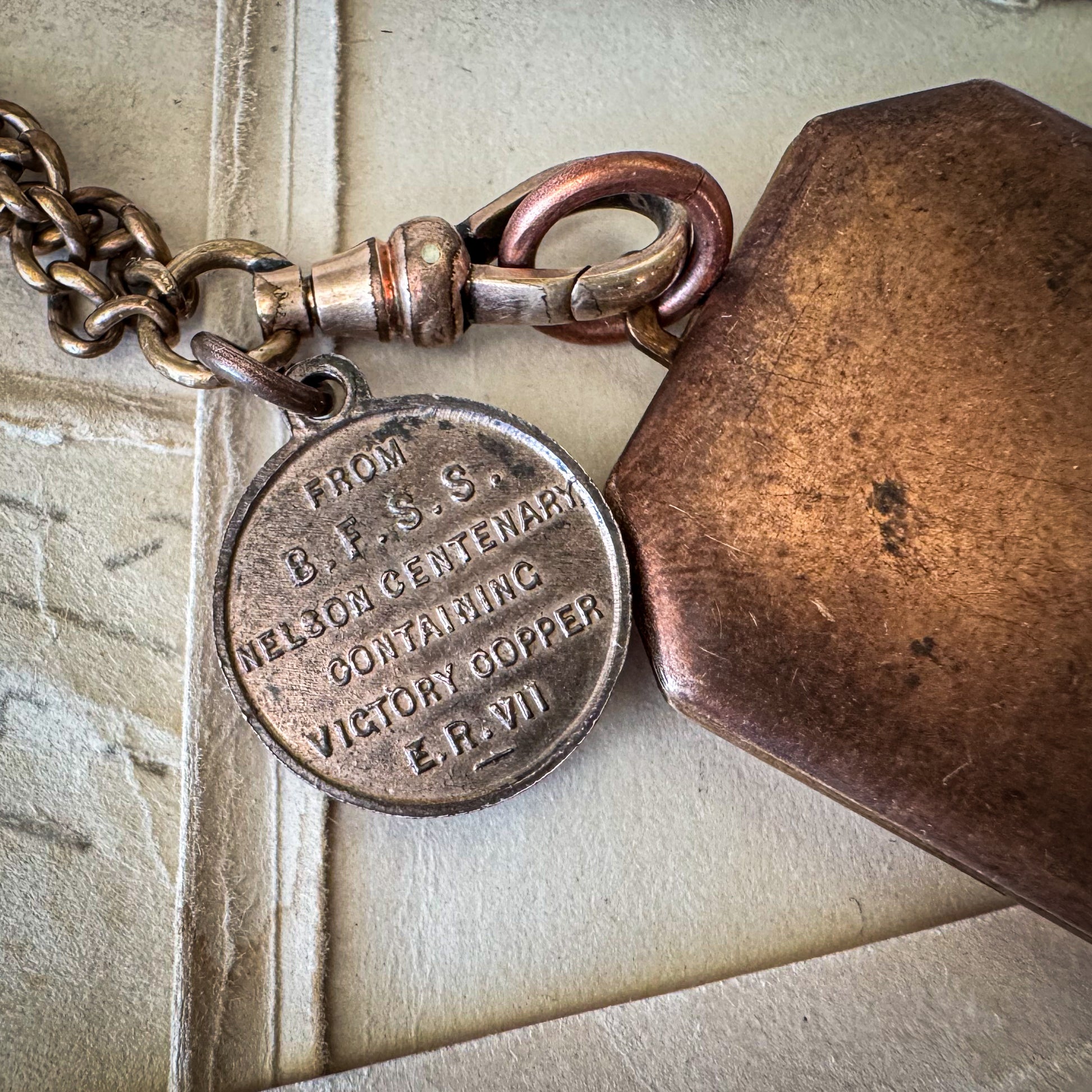 Created in 1905, this tiny medal celebrated the Nelson Centenary, featuring copper from the HMS Victory, with "ER VII" (Edward Rex VII) on it, offered by the British and Foreign Sailors Society.