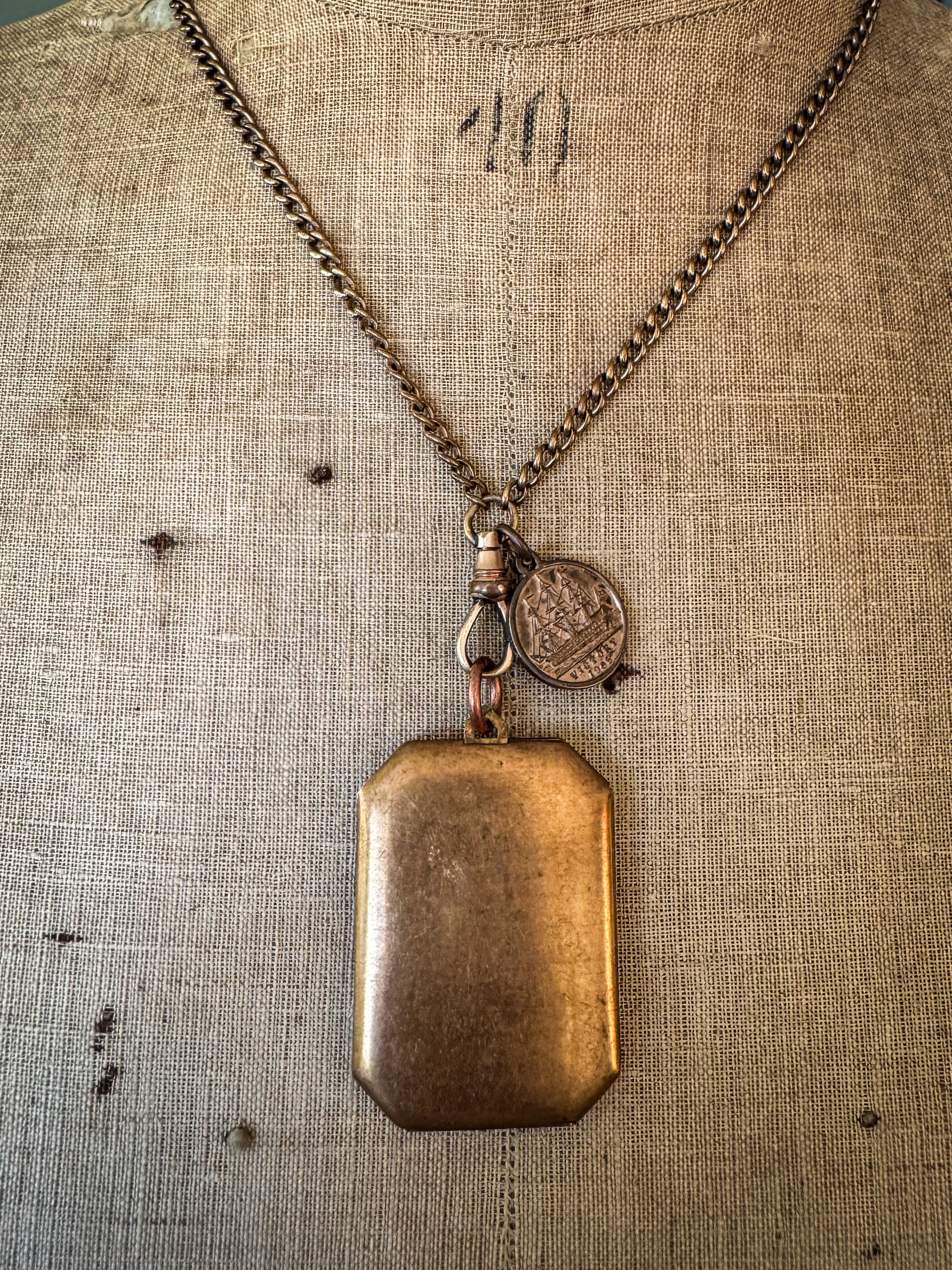 Celebrate history with this distinctive necklace crafted from antique and vintage treasures. An H.M.S. commemorative medal issued suspended from its original gold clip and chain, & paired with a gorgeous oversized vintage octagon locket. A truly unique boho chic statement piece, o stash your precious photos or tiny momentos.