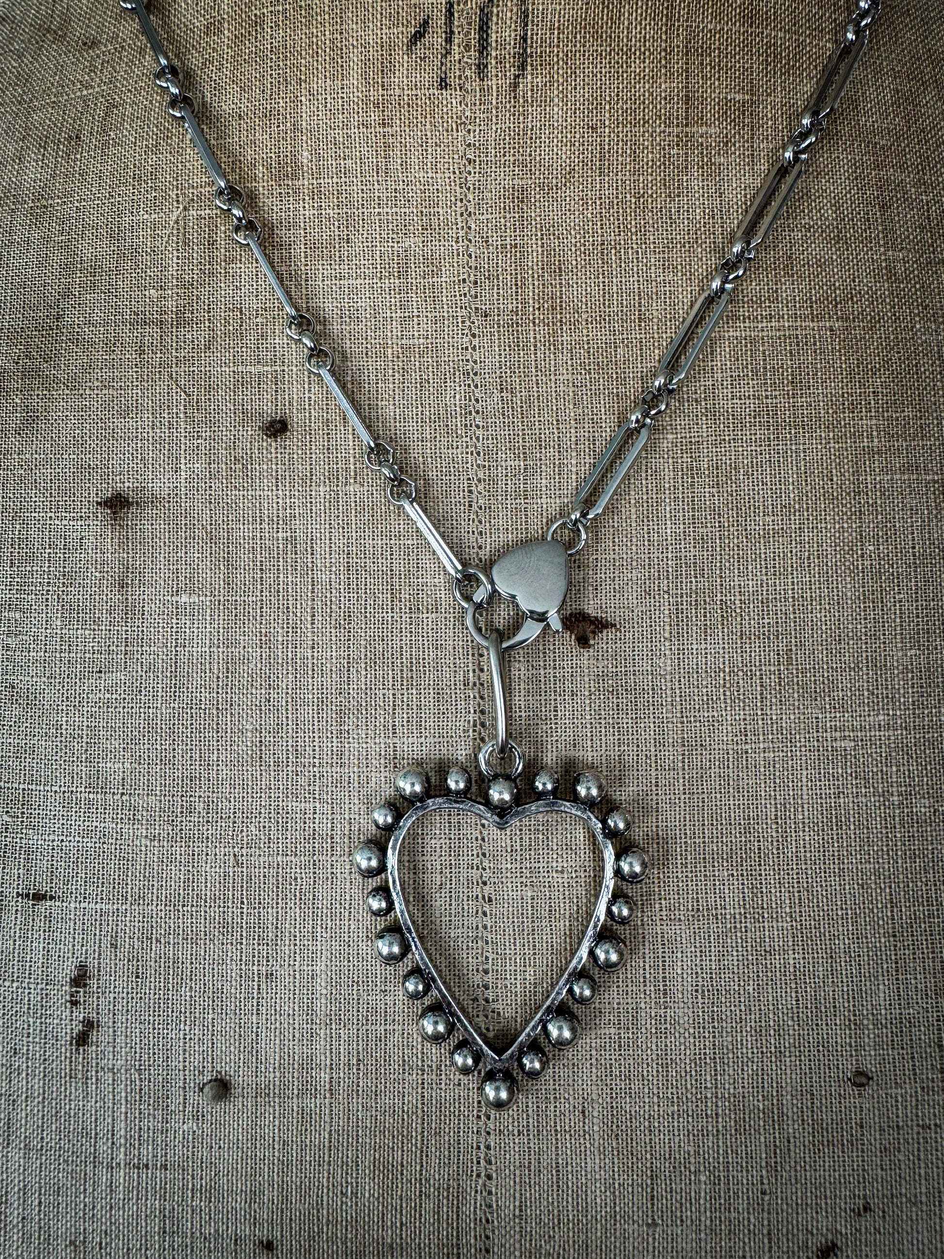This rustic chic open heart pendant hangs gracefully from a sleek stainless steel chain, blending effortlessly with any look in your wardrobe. Clasping at the front with a stylish heart shaped clasp, for even more love... this shorter necklace shines beautifully on its own or layered with your longer Hot Rocks pieces.