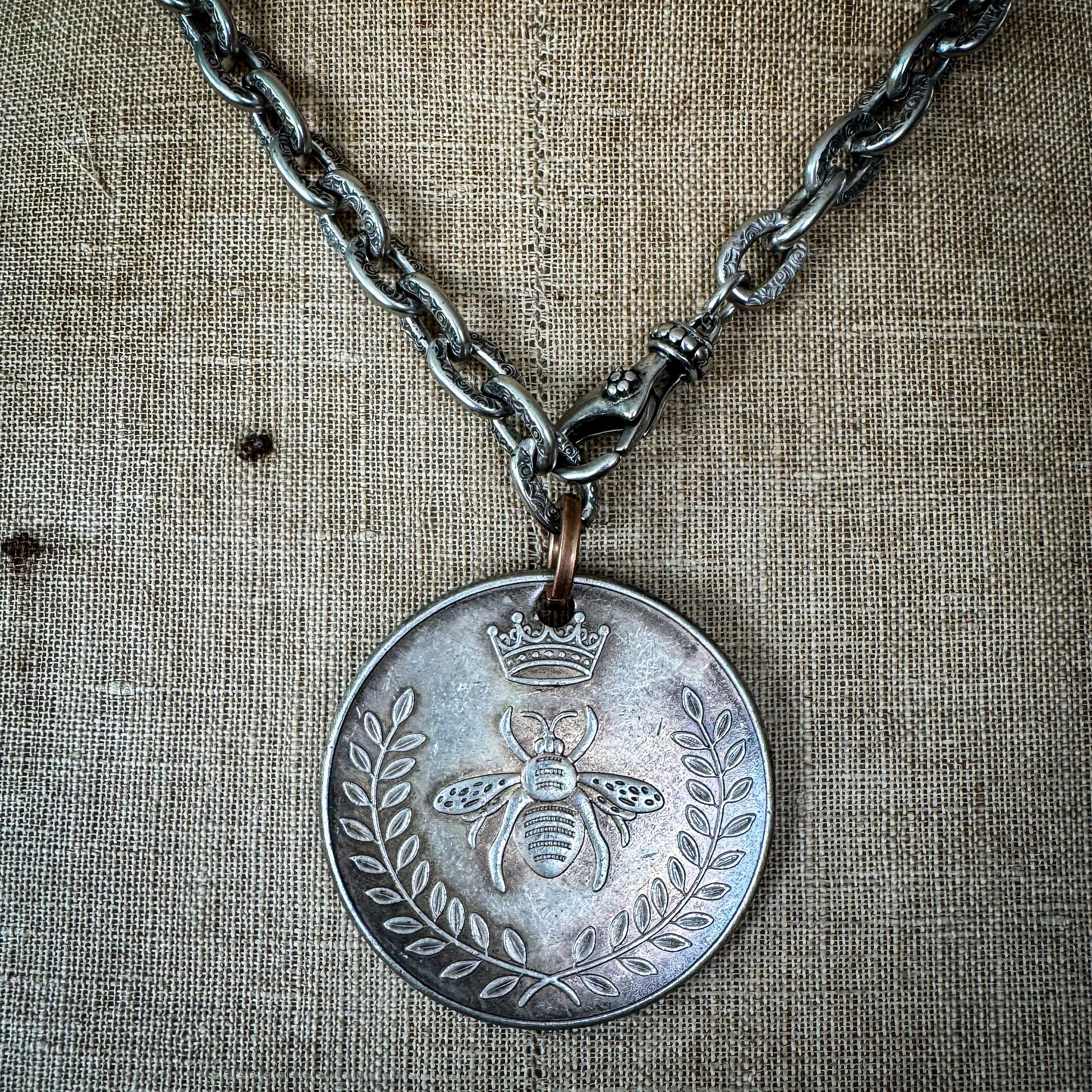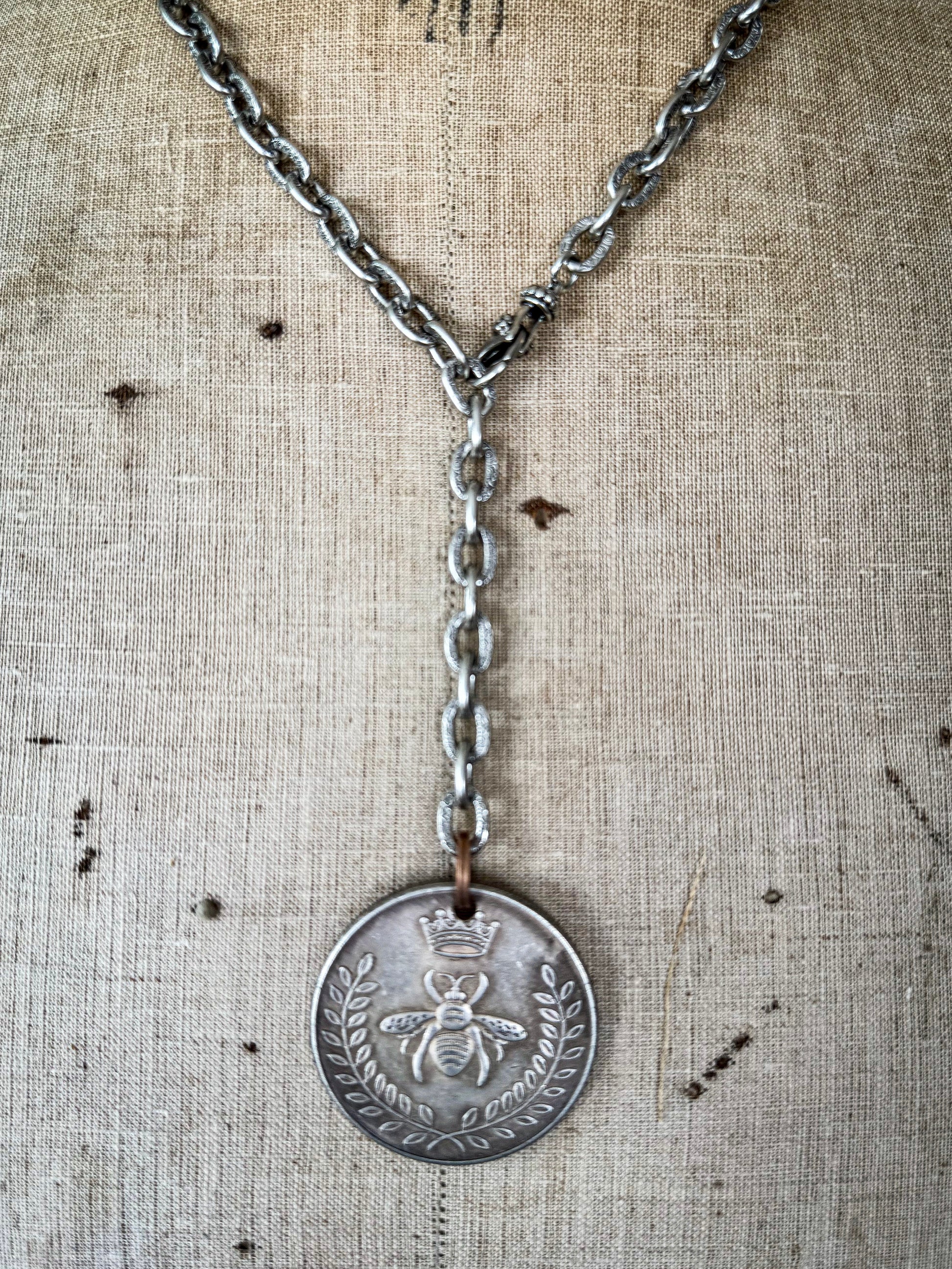 Wear this necklace your way by attaching the clasp to any front facing link, making a confident statement with every look. Finished with an aged patina for a timeless old world style, this artisan designed, double sided pendant necklace offers multiple styling possibilities. One side features a powerful bee, crown, and laurel leaf design, while the other boldly proclaims "Queen."