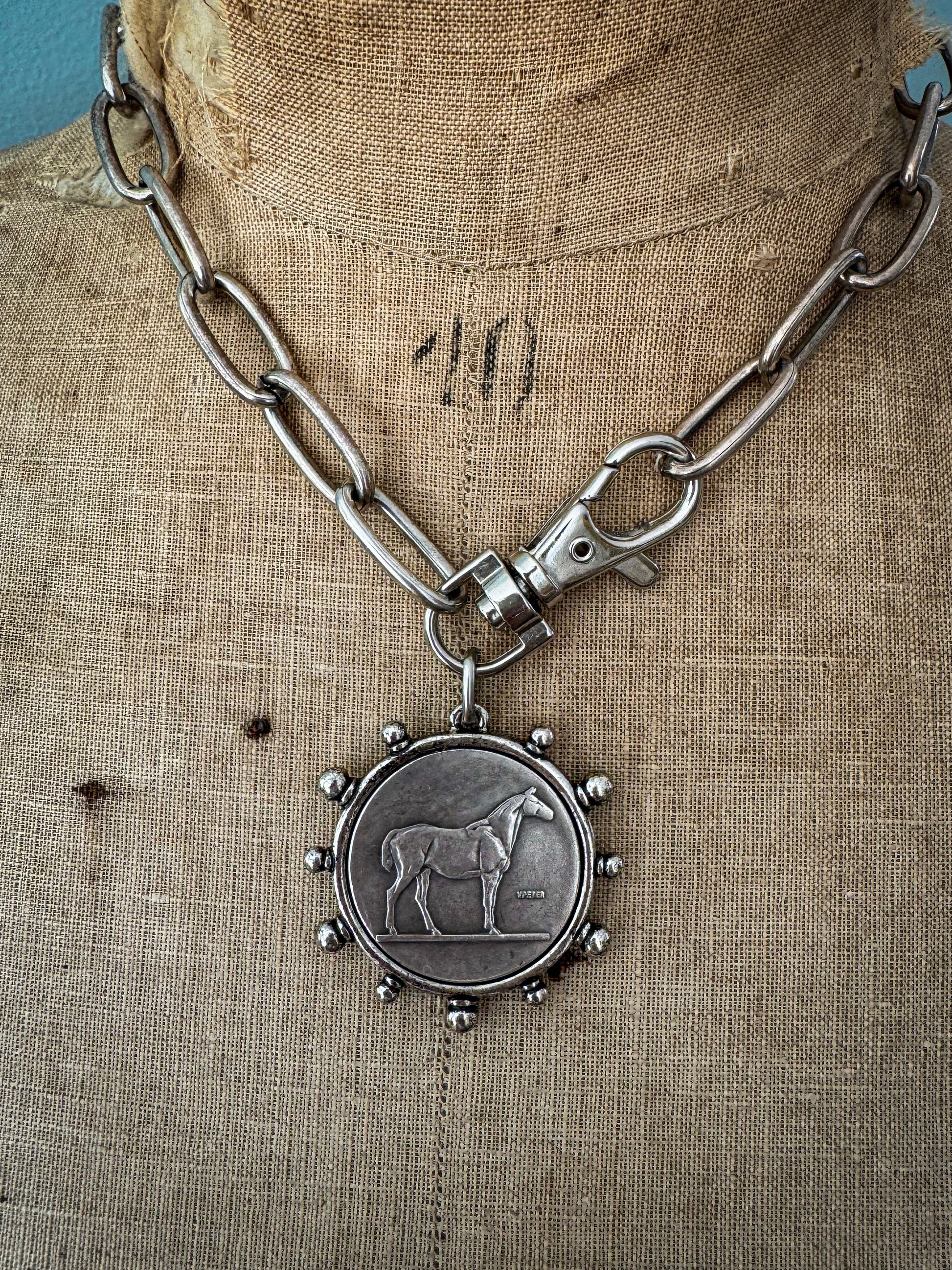 It's boot season, and nothing looks better with a gorgeous pair of leather boots, than a chunky chain necklace. I have added one of my favourite horse pendants to oversized vintage & repurposed aged silver links and finished with a bold industrial clasp, for maximum impact.