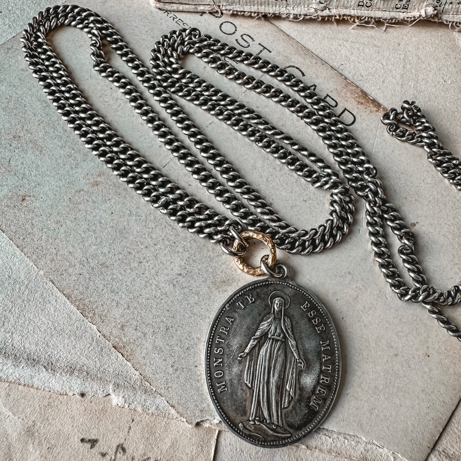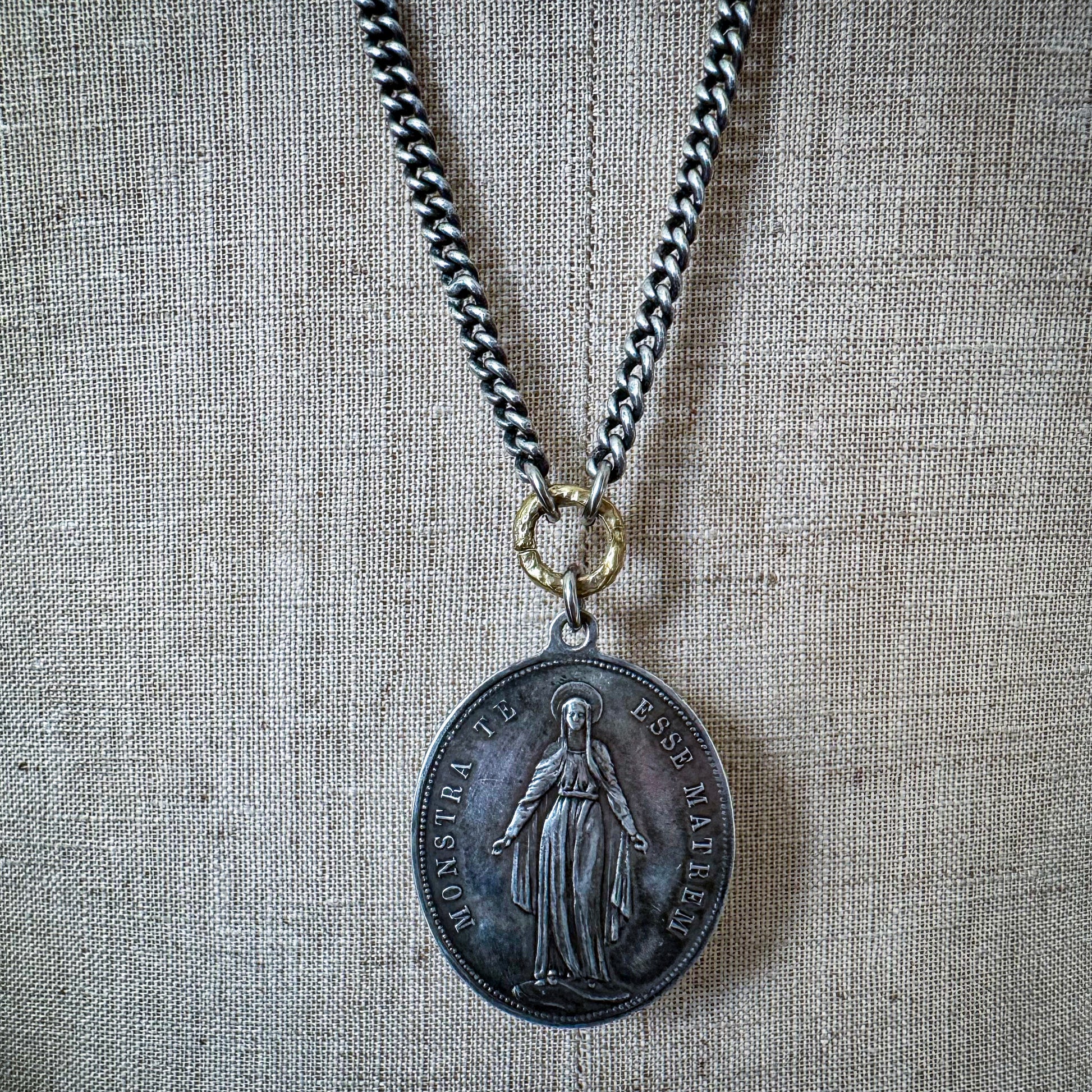 A special vintage sterling silver medal portraying Mary and the sacred Latin blessing "Monstra Esse Matrem"—"Show Me That You Are a Mother." The reverse side glows with a serene Marian star surrounded by lilies, embodying purity and spiritual renewal, surrounded by the words, "Congregation of the Children of Mary."