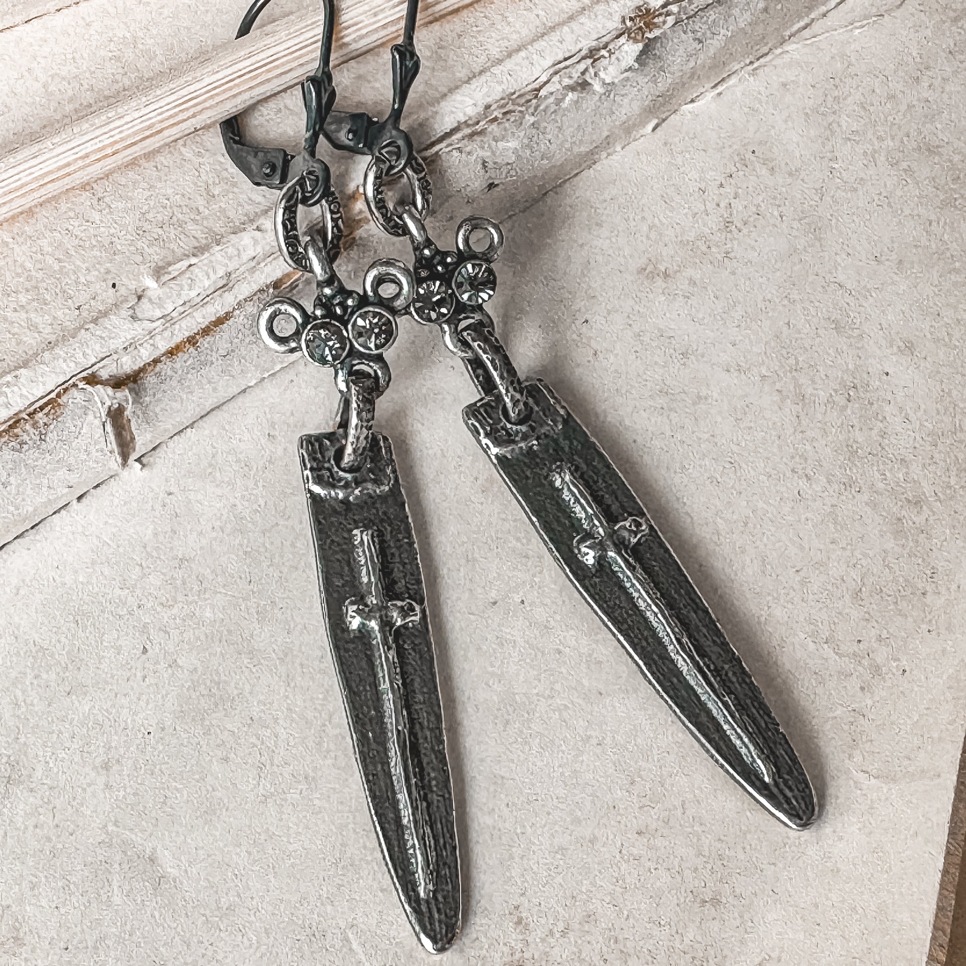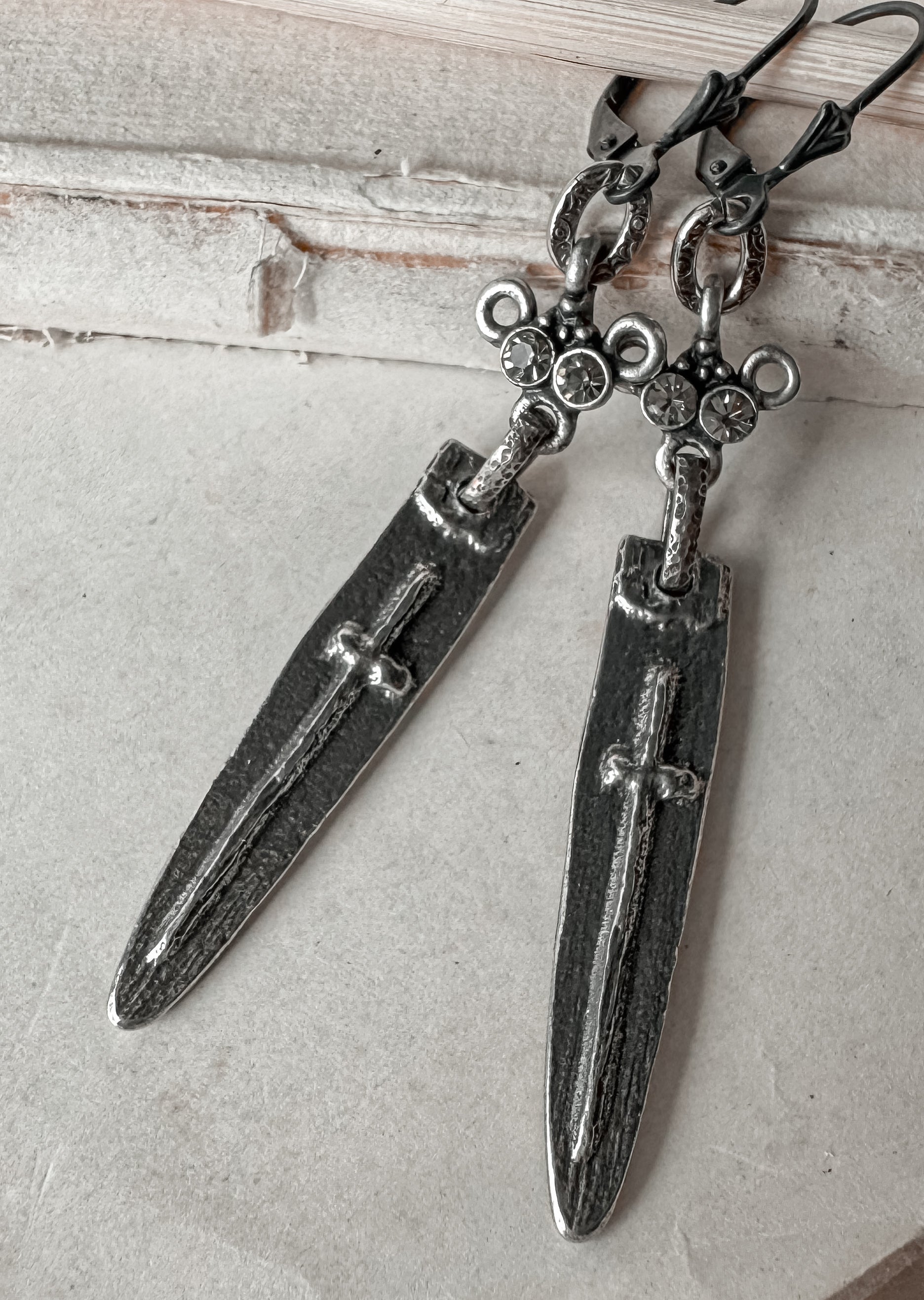 Strong, courageous and fierce! Let this pair of earrings empower the woman within. Cross embellished grey, polished pewter swords dangle from hammered links and rhinestone embellishments. All suspended from sterling silver ear wires, that have been aged for an old world feel.