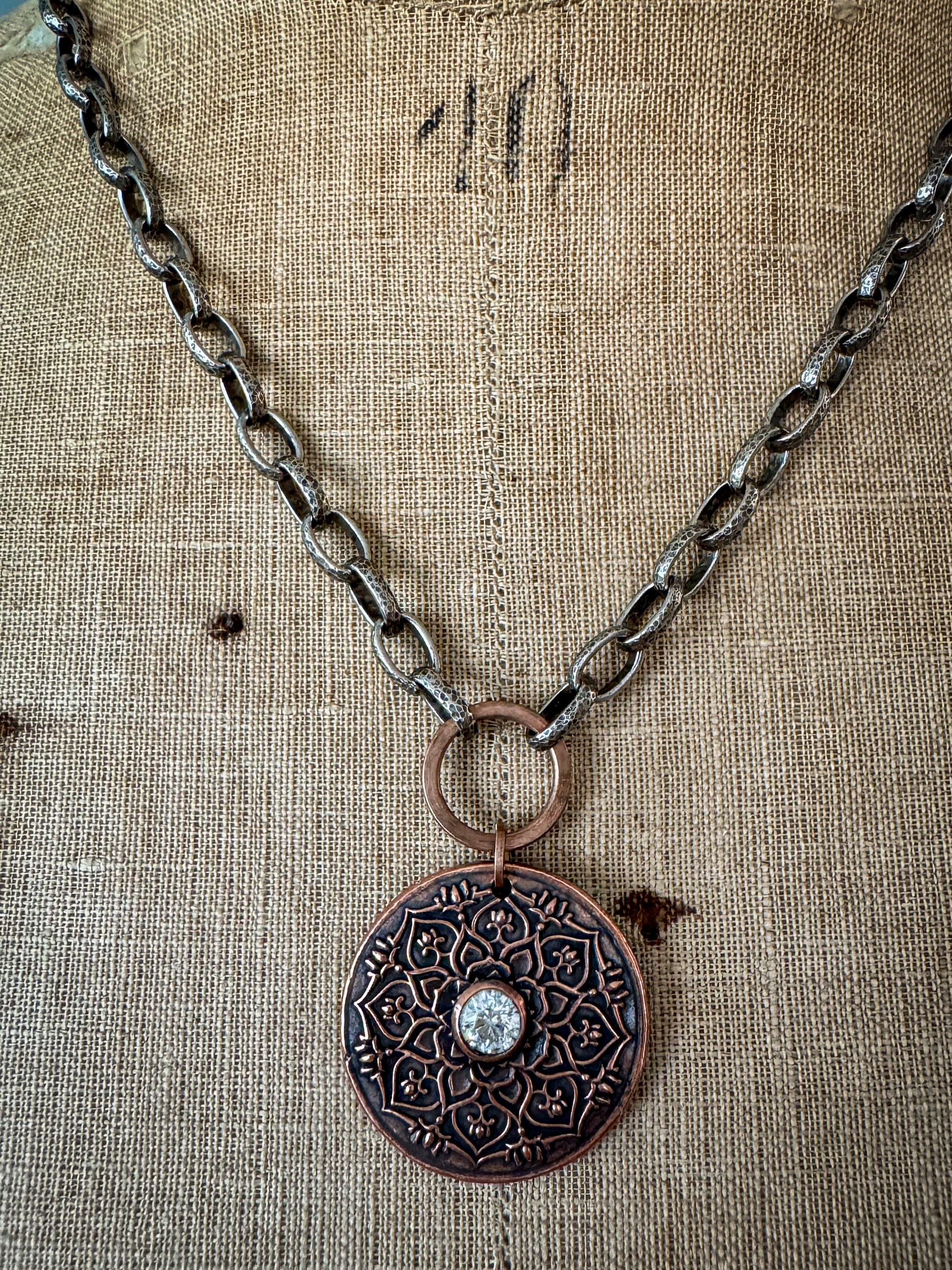 Handcrafted from pure copper, this beautifully detailed mandala pendant has been given a pretty touch of sparkle with a dazzling cubic zirconia stone set into the center. Suspended from a bold ring and hammered textured silver links, this mystical pendant is easy to wear with just about everything.