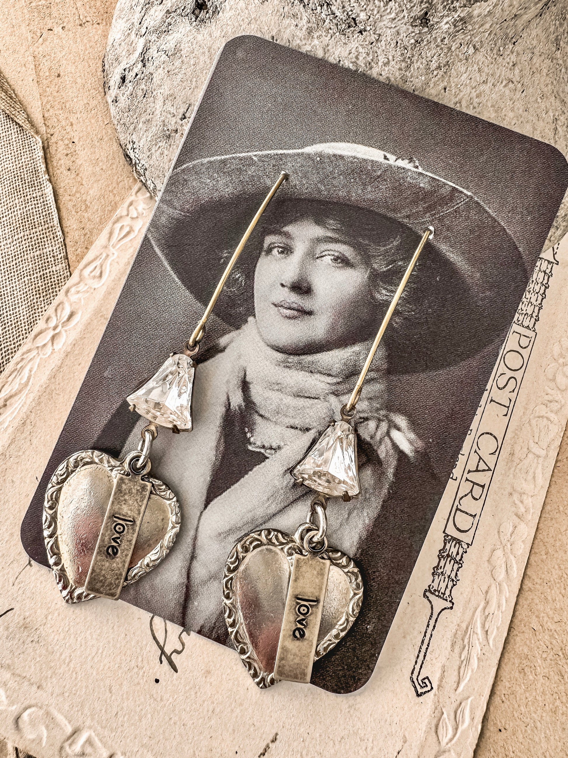 Celebrate love and nostalgia with these captivating, shabby chic earrings. Golden toned hearts & vintage sparkling rhinestone emit maximum romantic vibes in this pair of dangle earrings., The pretty hearts were rescued from a vintage charm bracelet, & get an added touch of love, from tiny, antiqued brass charms, etched with the word, love.