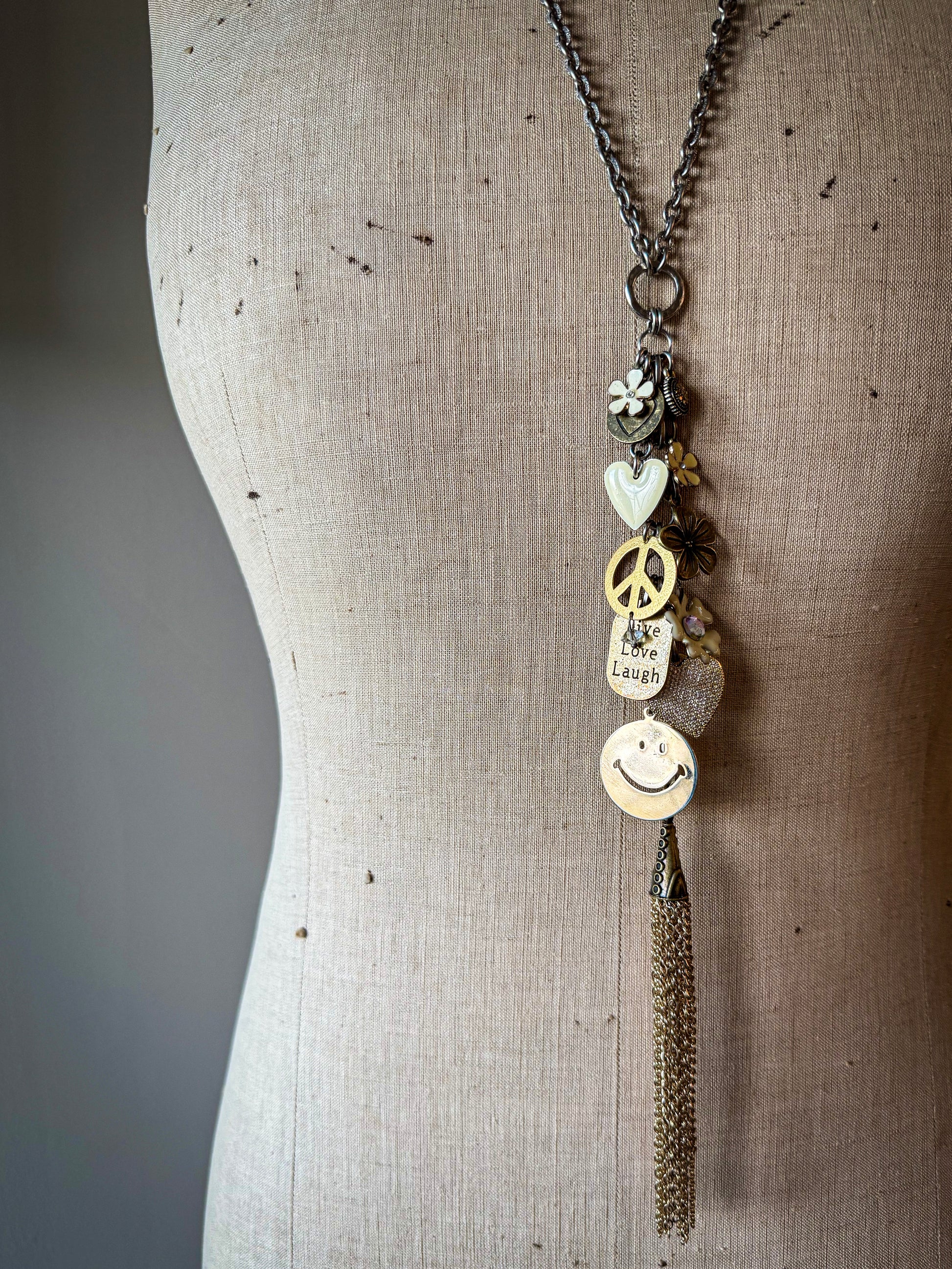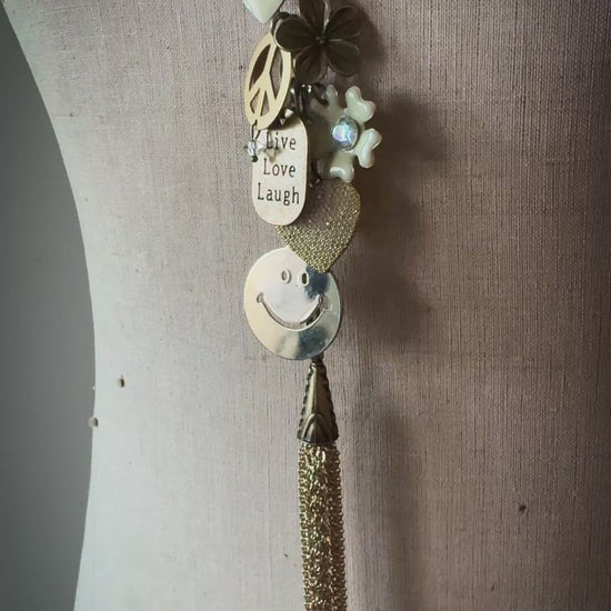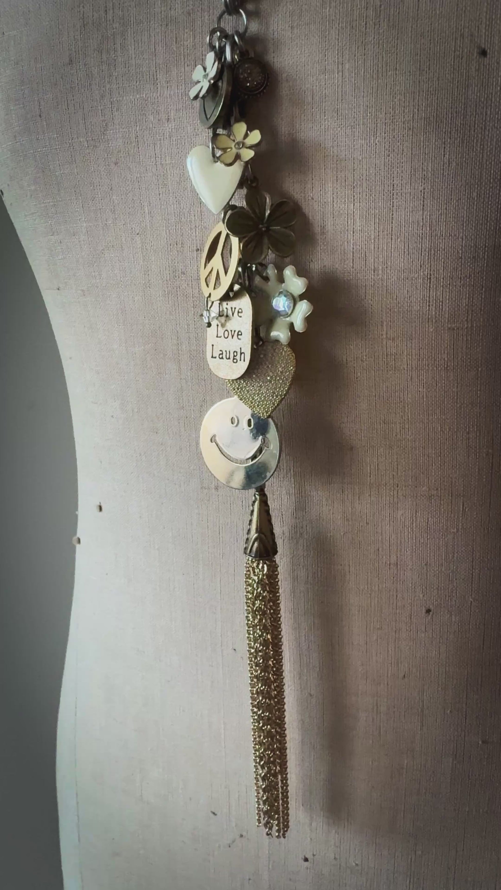 Adorned with cheerful florals, romantic love hearts, a gleaming peace symbol, a grinning smiley, and a stunning tassel crafted from vintage chain strands, this piece is your daily reminder to live boldly, love deeply, and never forget to laugh.