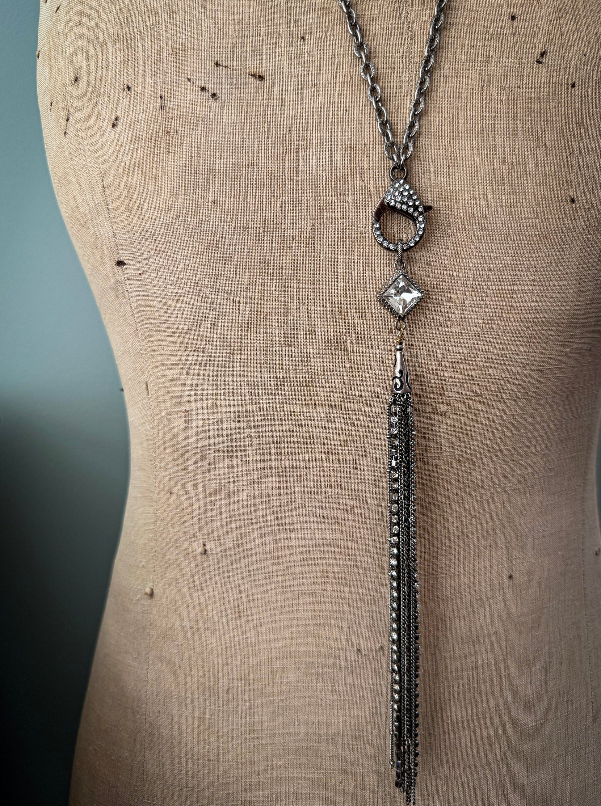 Created with salvaged segments of vintage chains and rhinestones, this long tassel is topped with a repurposed silver cone, all hanging from a gleaming ice clear diamond shaped pendant and finished with a gorgeous pave gunmetal clasp. Fabulous!