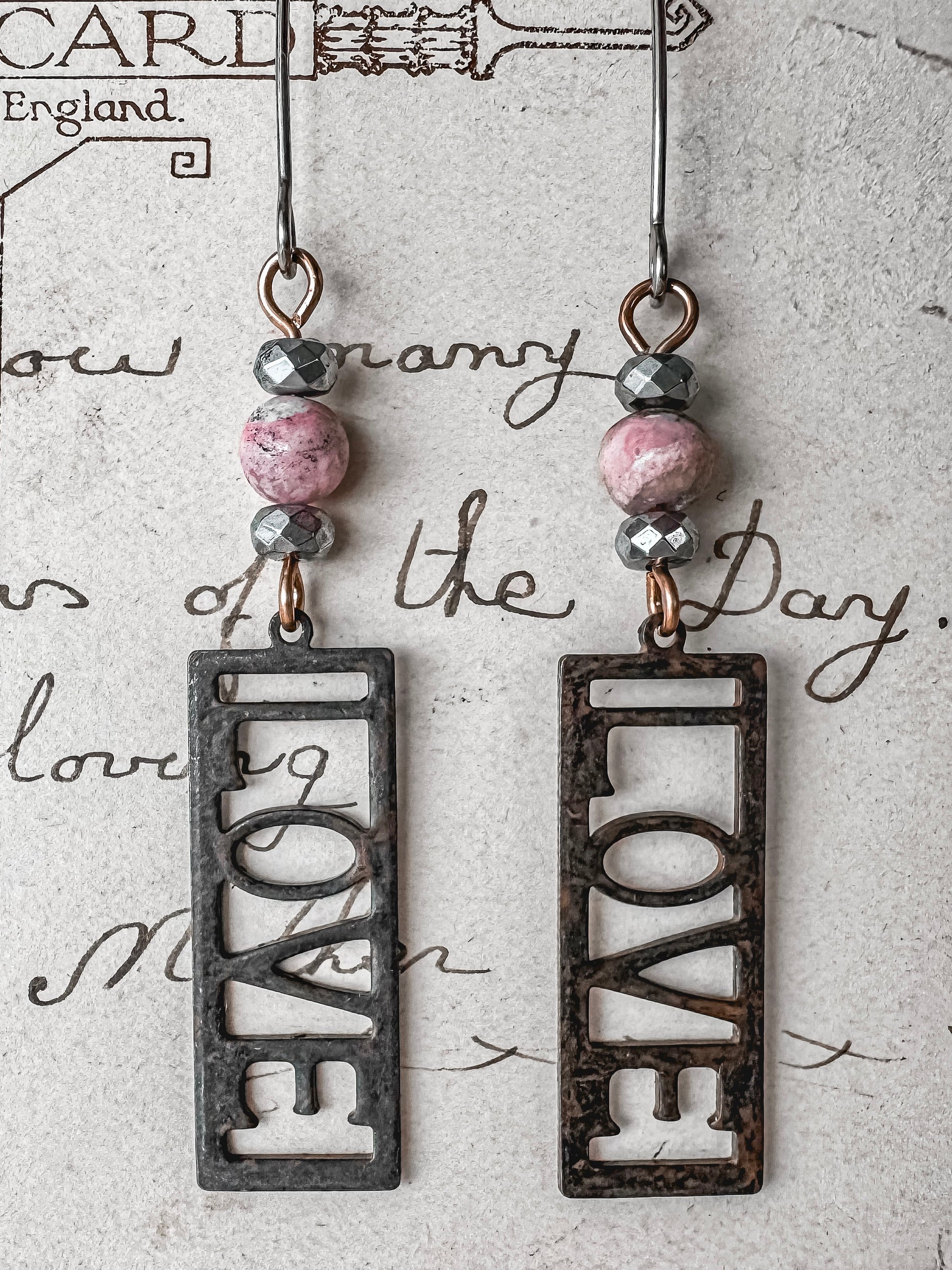 Make a statement without saying a word. This pair of feather light, dangle earrings feature rustic brown LOVE charms accented with pretty, soft blush pink and glimmering silver gemstones. Infusing vintage vibes with boho chic style, these beauties are sure to get you compliments galore!