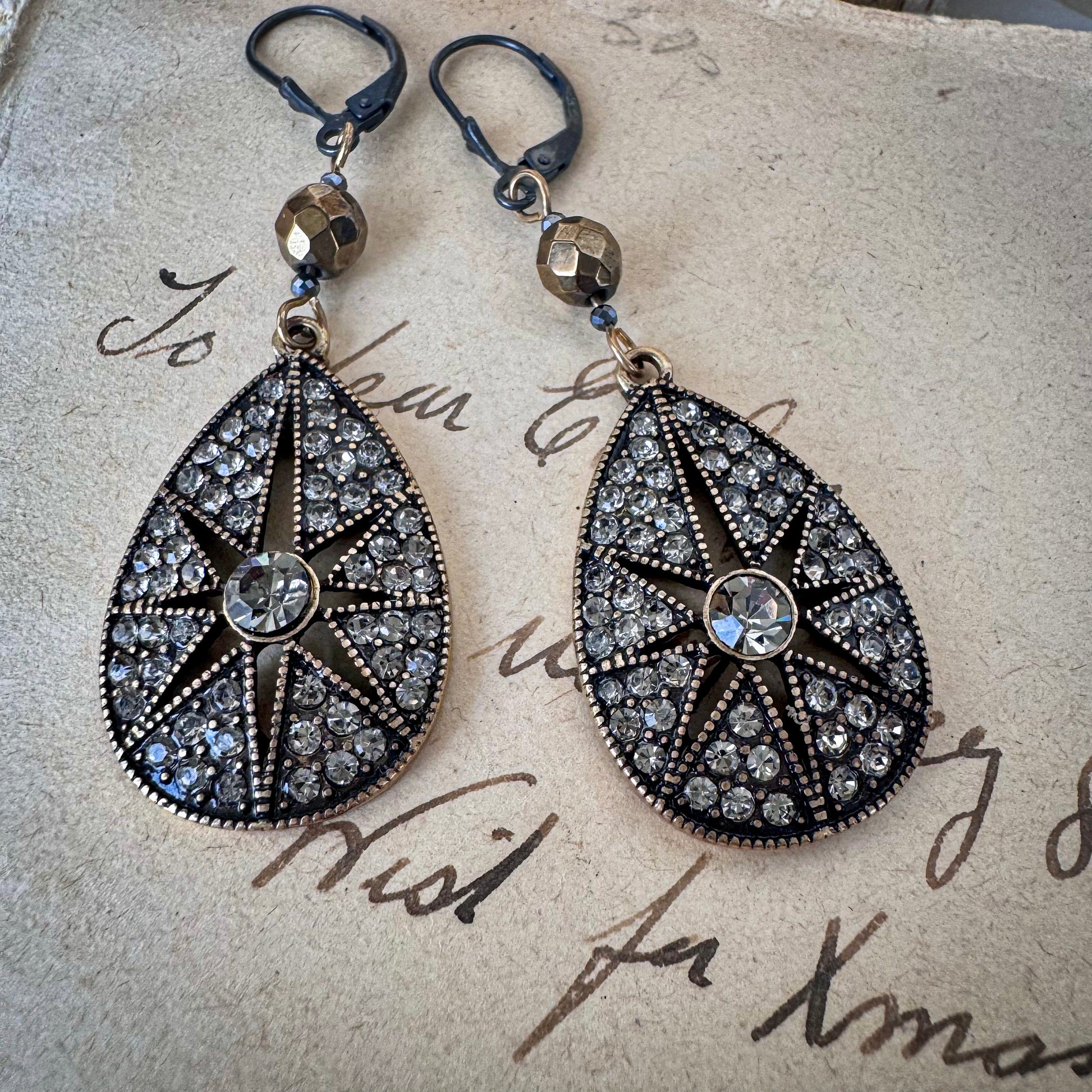Celestial charm meets vintage allure in these enchanting star earrings. Dazzling rhinestone encrusted antiqued bronze earrings, showcasing a fabulous cut out star design. Suspended from gleaming, bronzed gold hematite stones and oxidized sterling silver lever back ear wires, for a fabulous aged effect. These sparkling beauties will be the life of the party!
