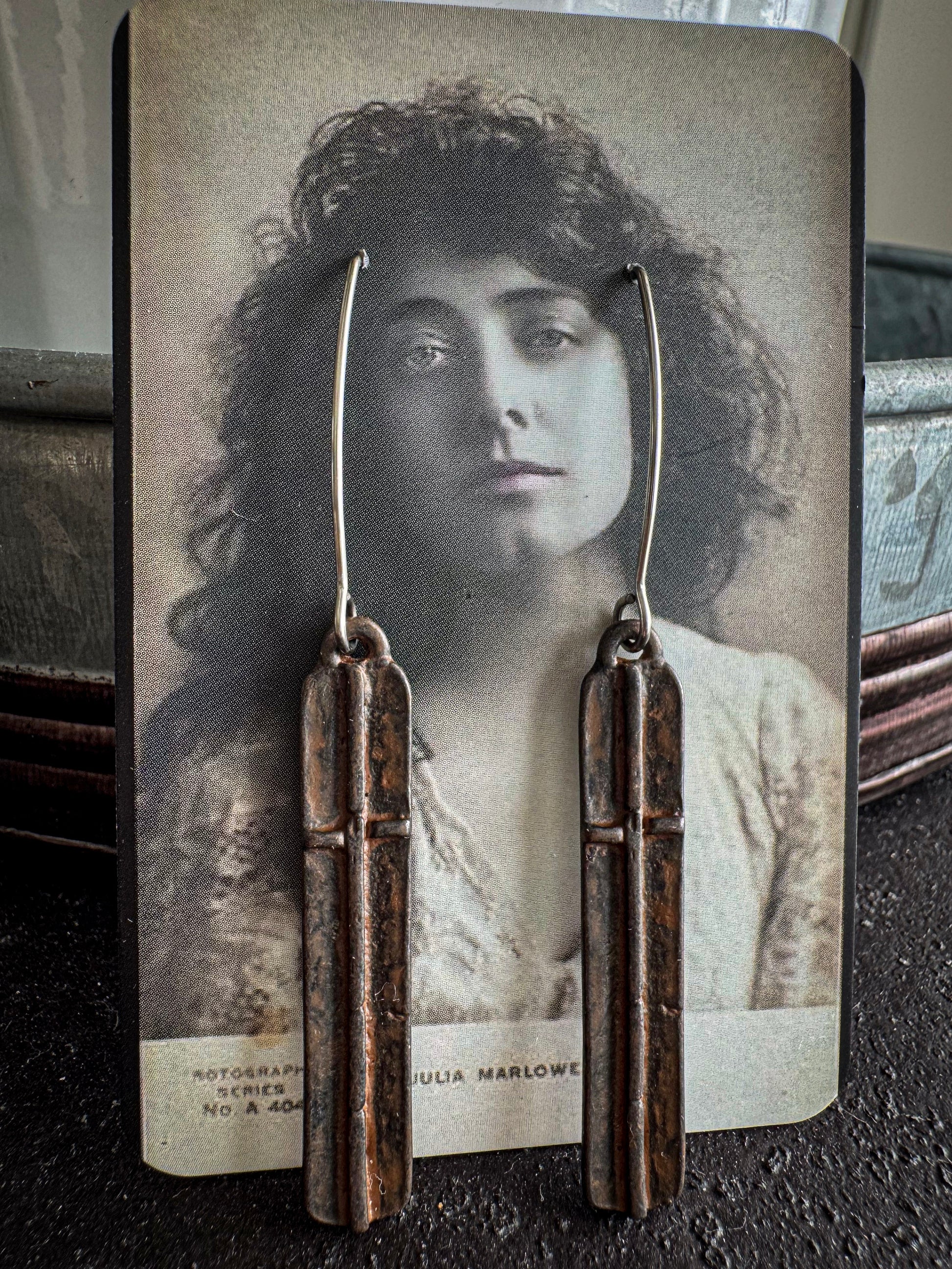 Combining an aged brown finish with sleek stainless steel ear wires for an edgy and cool, mood. These long, modern rustic, cross earrings add unique style to any outfit. Light weight and comfortable to wear.