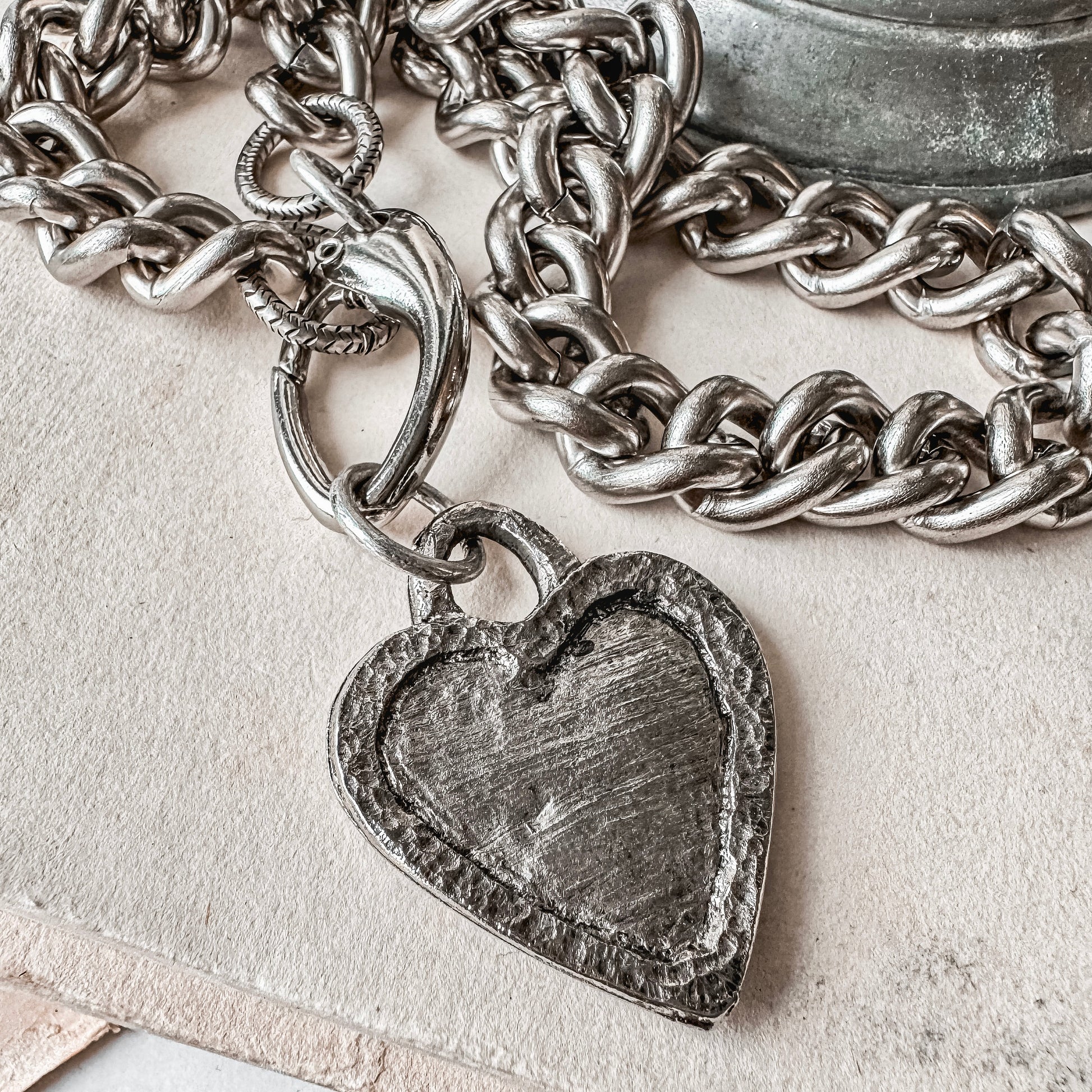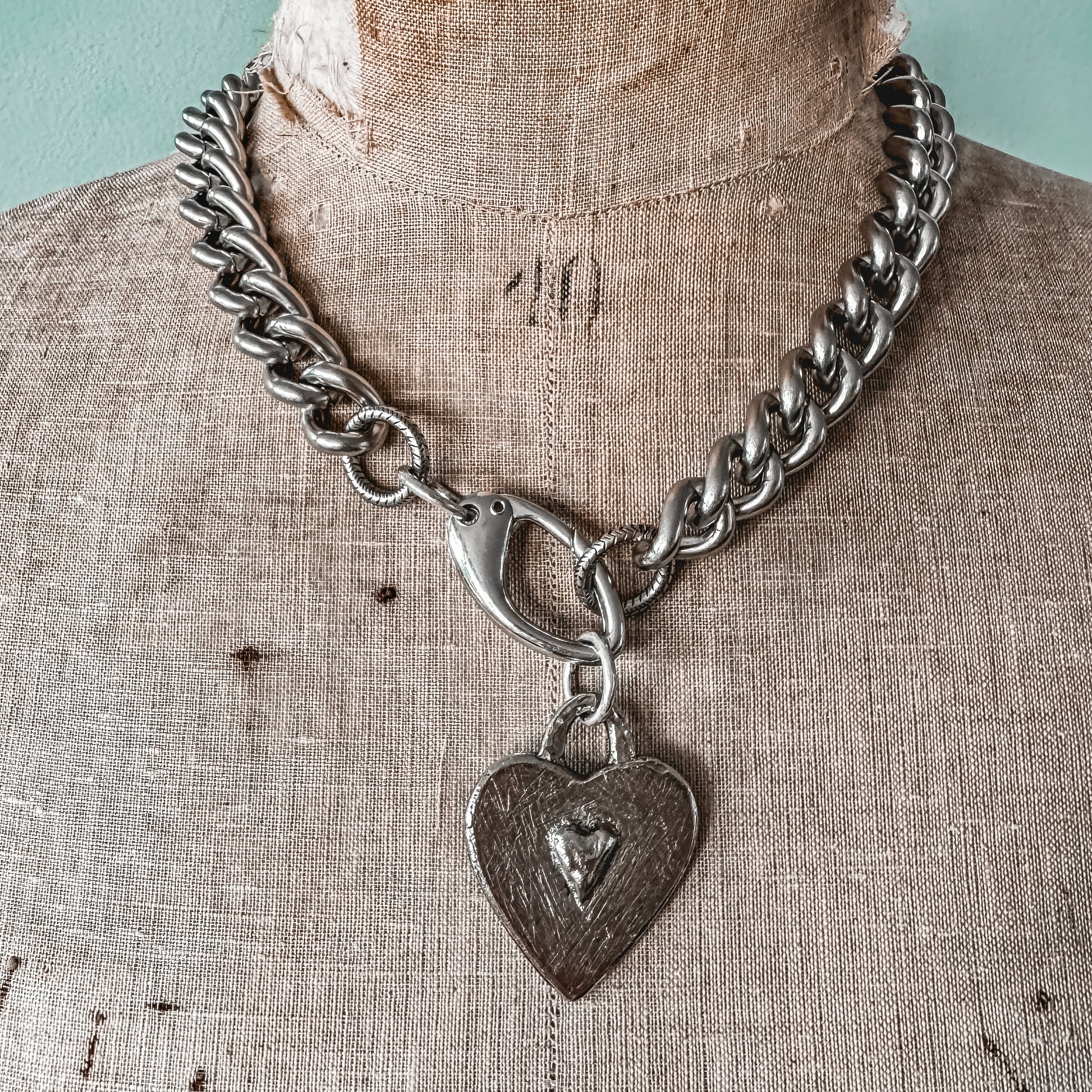 Make a statement with this show-stopping necklace that perfectly blends edgy attitude with romantic charm. Finished in a rich antiqued pewter tone, the chunky Cuban curb chain anchors a reversible, rustic heart pendant that's anything but ordinary.