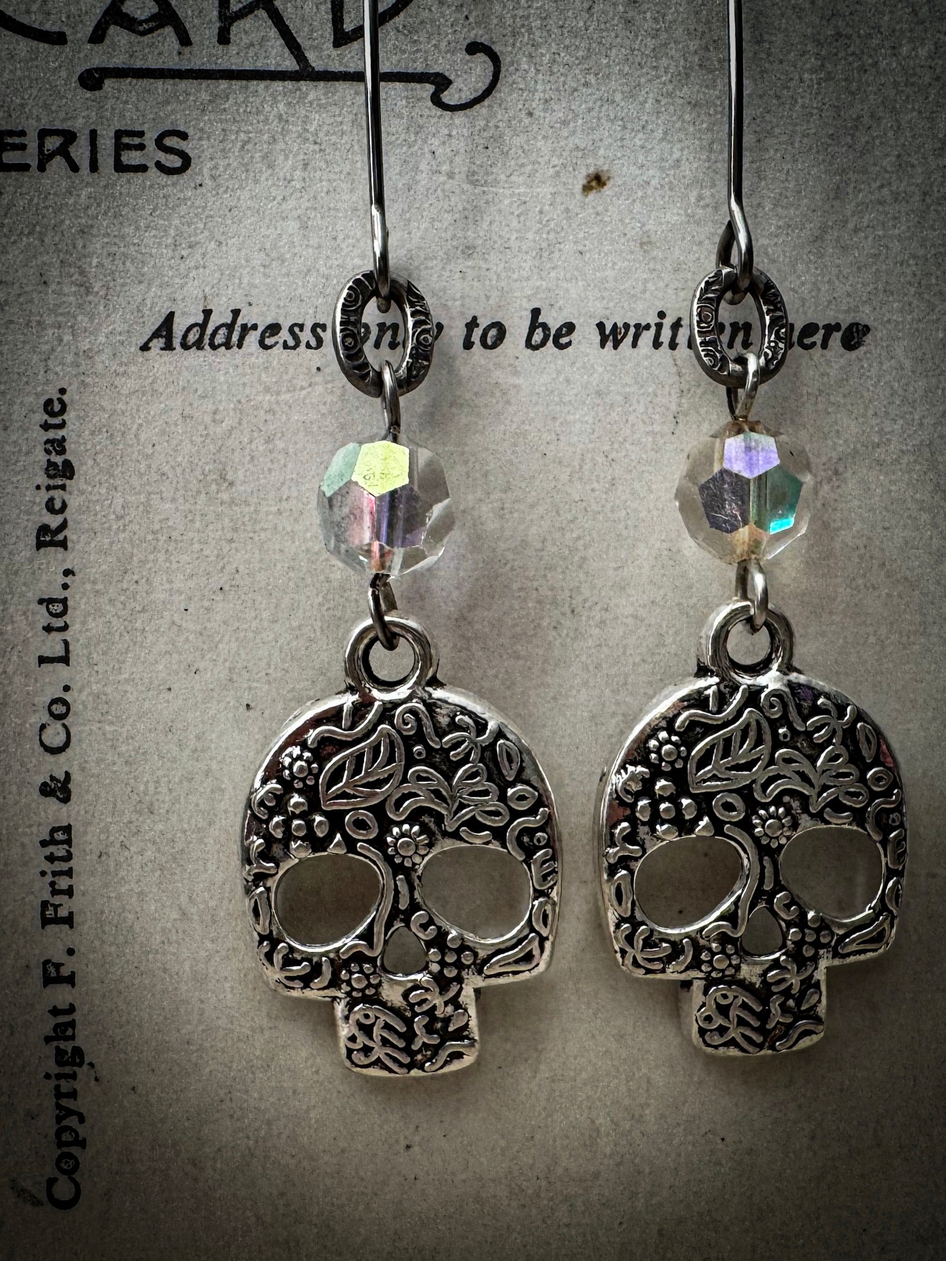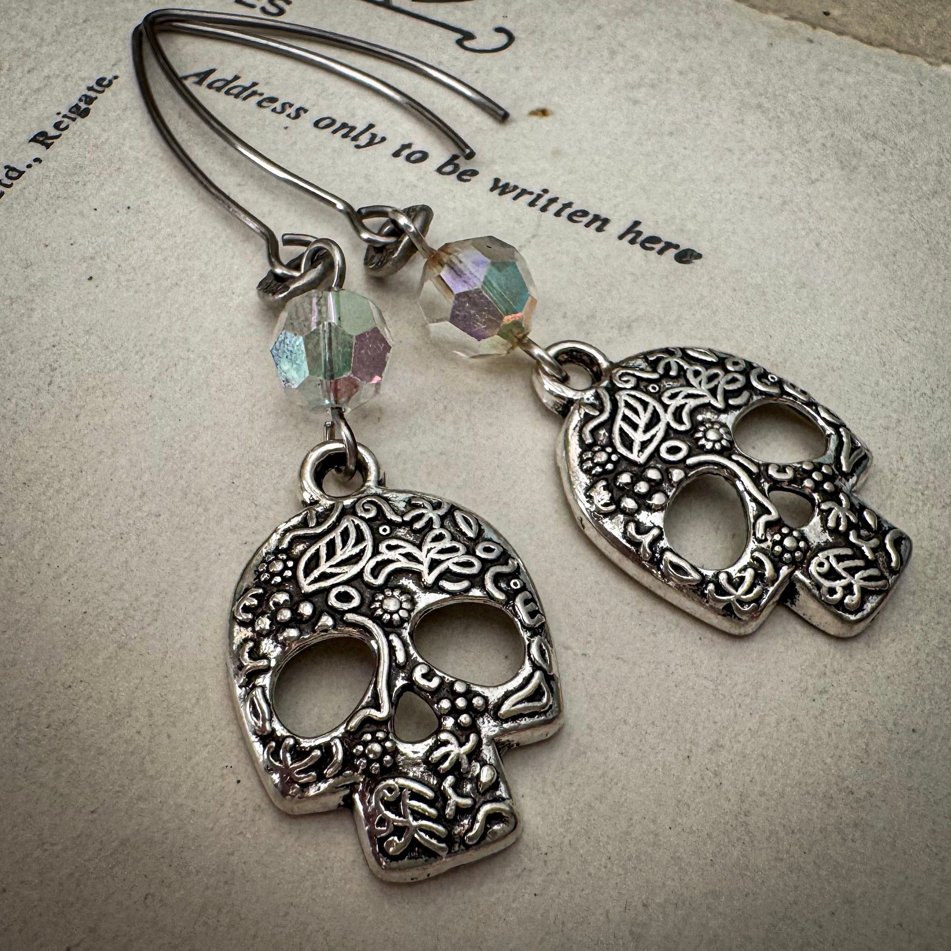 Honor the Day of the Dead festival, a time to welcome back departed souls, with these floral-adorned sugar skulls, known as "Calaveras" in Spanish. Featuring vintage aurora borealis crystals that shimmer with a subtle rainbow of colours, these lightweight earrings hang from modern ear wires and are sure to earn you plenty of compliments.