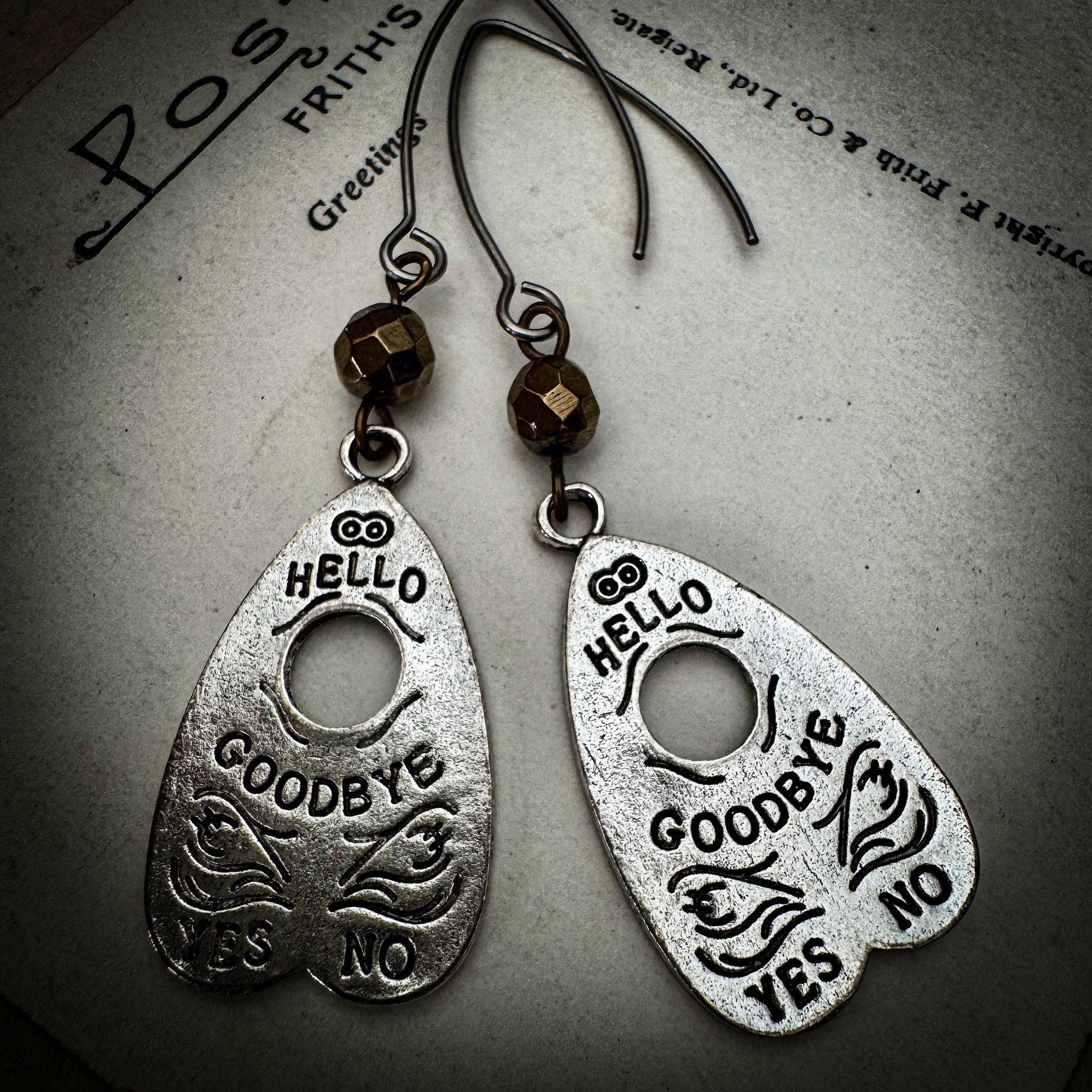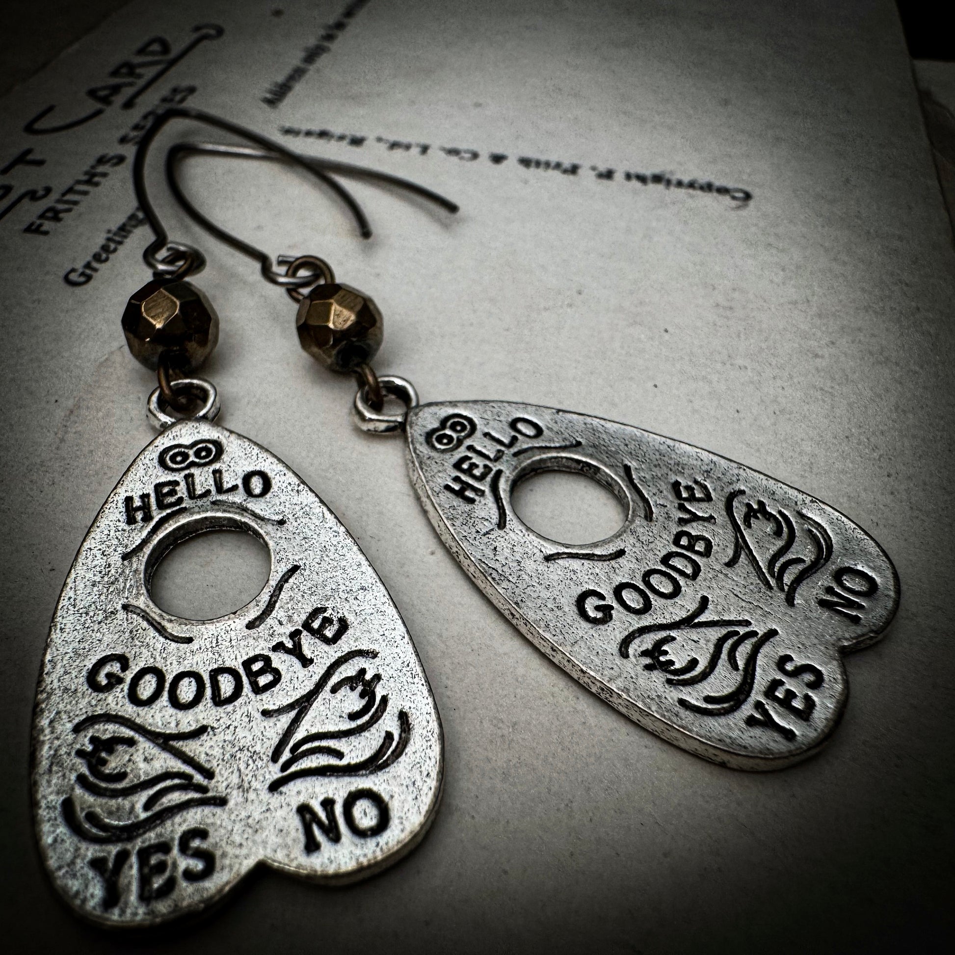 These earrings are sure to draw attention. They feature Victorian-inspired ouija board planchette charms, with the words Hello, Goodbye, Yes, and No. The Ouija board was a favoured parlour game among Victorians, who were captivated by all things supernatural.
