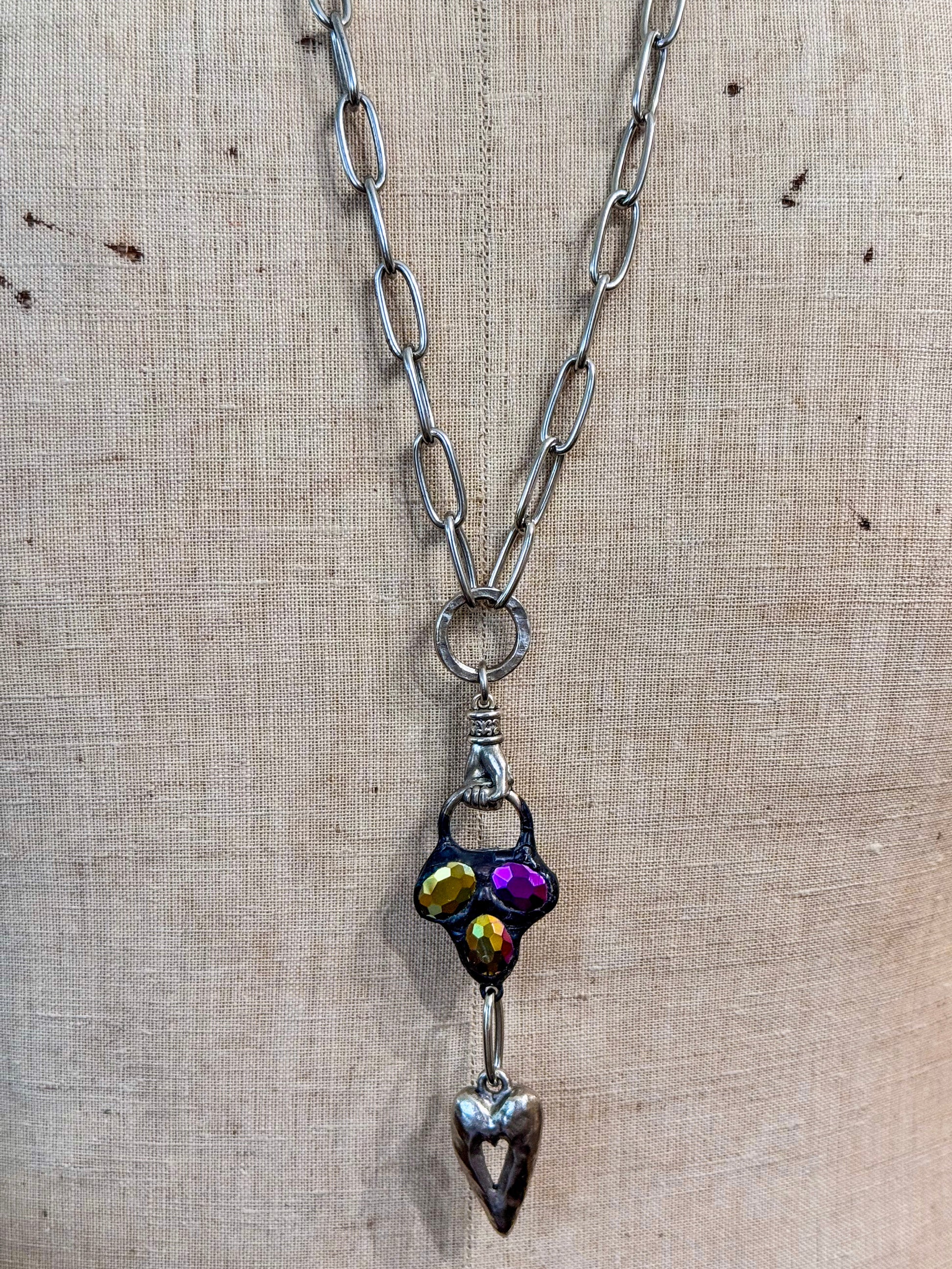 A one of a kind necklace, sure to bring you compliments galore! This enchanting pendant, combines dazzling jewel toned crystals, being held by a hand, and suspending a heart.