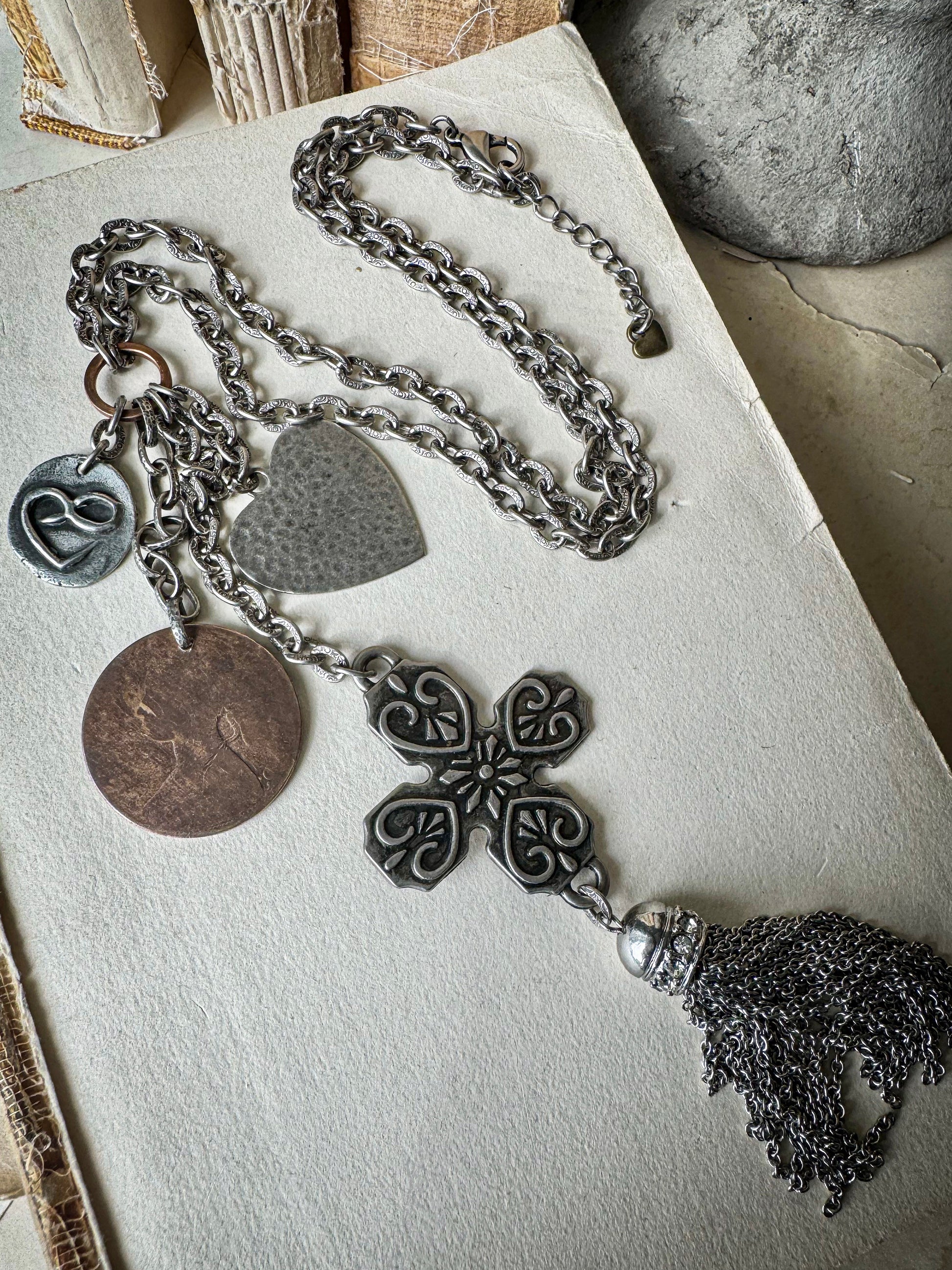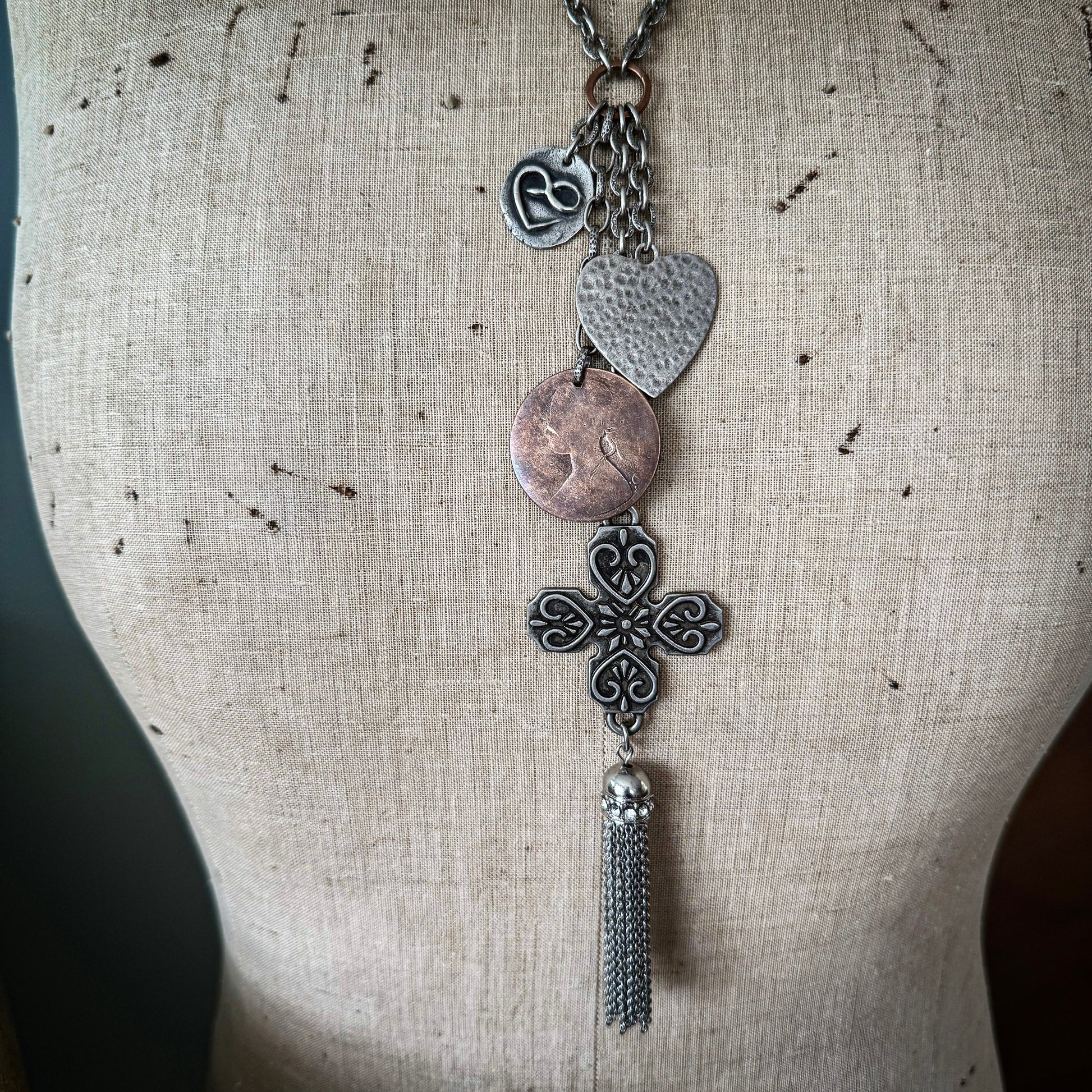 Bringing together an array of textures, including a rustic hammered heart, a smooth timeworn Victorian coin, a repurposed cross with a raised heart design, a vintage chain tassel, and a pewter Infinity heart charm, this necklace brings edgy boho chic style to everything you wear.