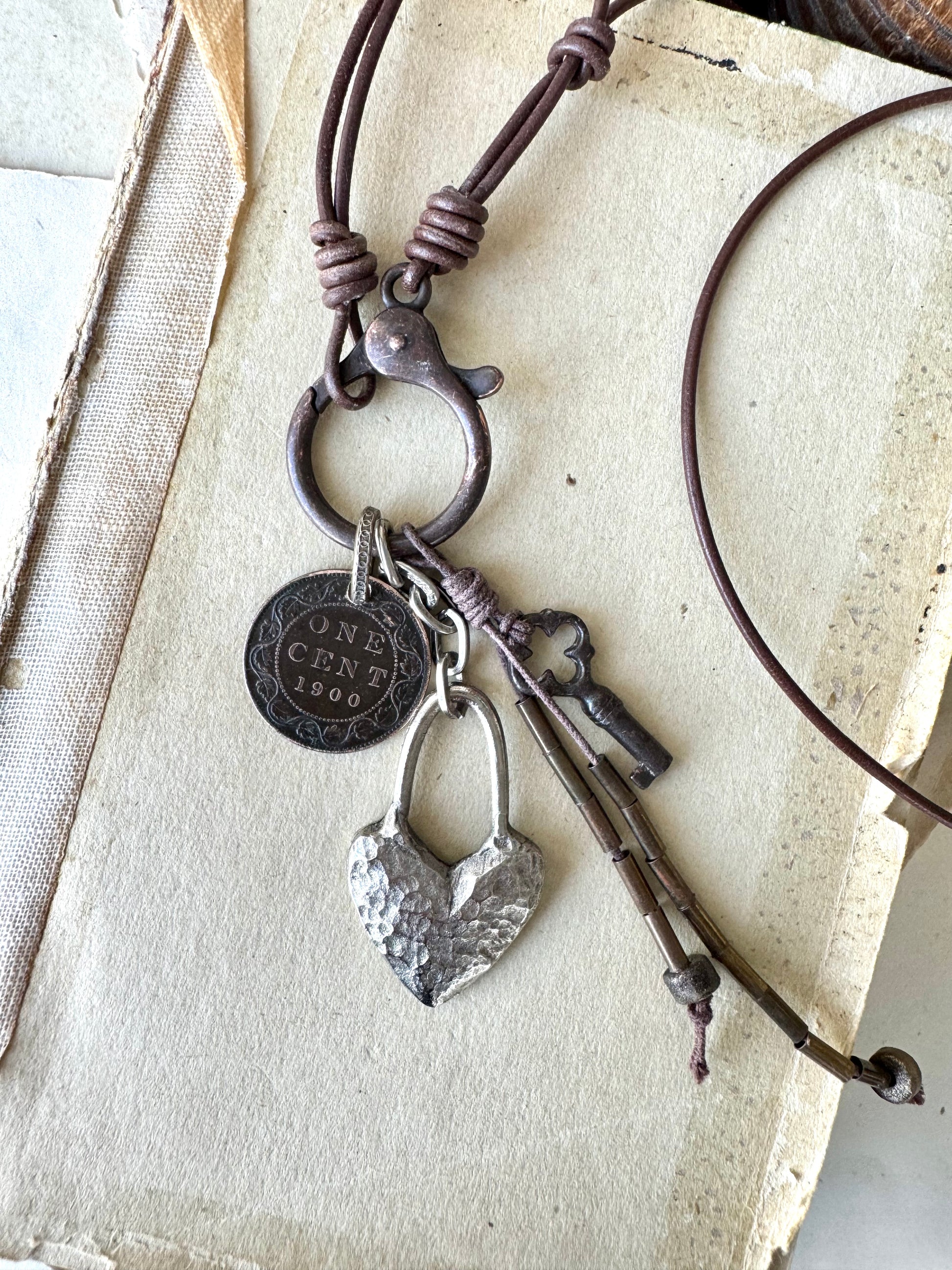 Combining one of my favourite artisan designed hammered pewter hearts, with a wonderful, time worn coin, and a sweet antique key. All suspended from supple, chocolate brown, leather cording, anchored by an oversized rustic clasp. The warm brown and bronze tones create an effortlessly casual aesthetic that pairs beautifully with denim.