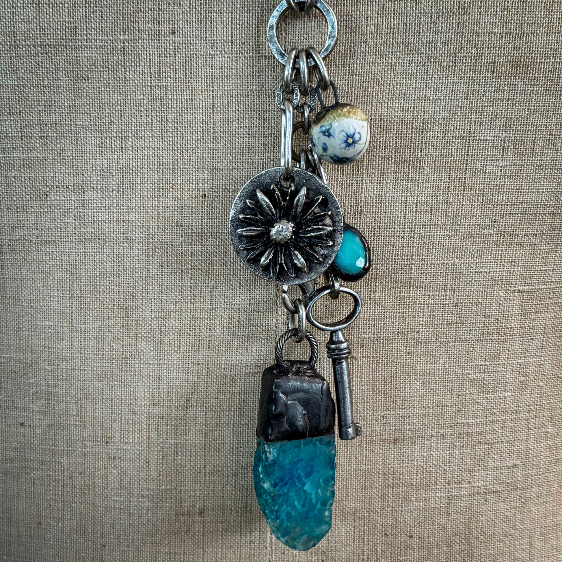For all the bohemian souls, this long necklace captures natures pretty blooms & earthy elements with the tranquil colours of the water & the sky. I have combined beautiful, handcrafted artisan charms with a cherished vintage key, creating a story of love & serenity that celebrates nature.